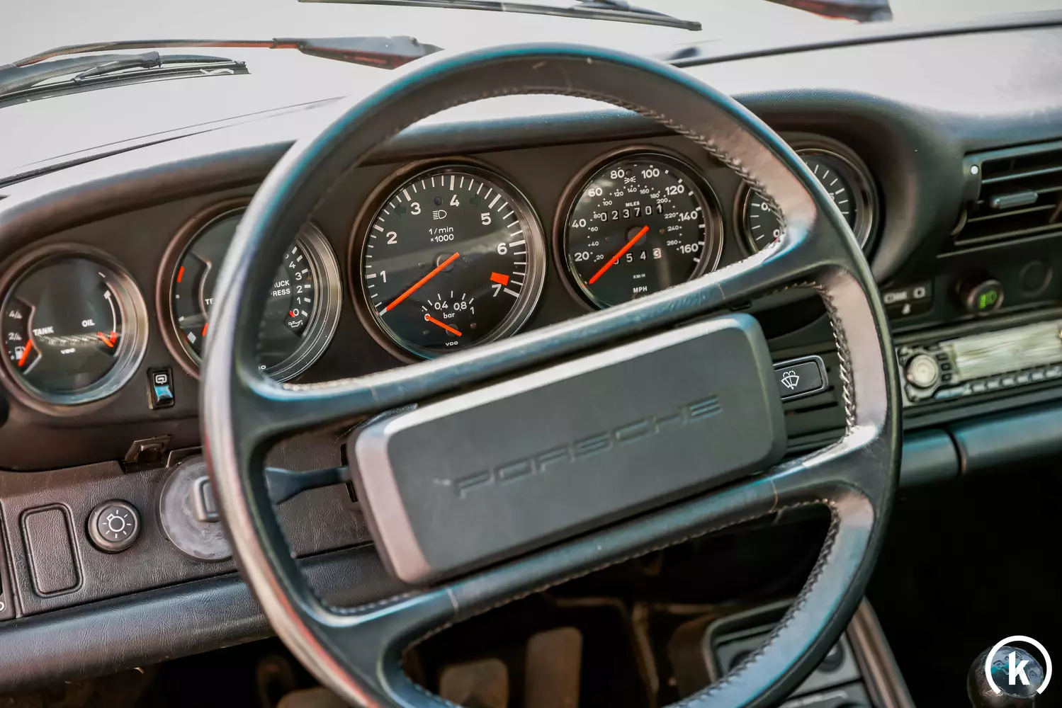 Die charakteristischen 5 Rundinstrumente des Porsche liefern allesamt wichtige Informationen rund um den 911 Turbo: Eine Modifikation stellt der Austausch der Uhr durch eine Ladeluftdruckanzeige dar. Lediglich 23.701 Meilen, also umgerechnet ca. 38.150 Kilometer hat dieser Wagen seit seiner Auslieferung gelaufen. Ein Scheckheft sowie eine Vielzahl an Unterlagen und Belegen zum 911 liegen vor, zudem ist auch ein CarFax abrufbar. Sämtliche Instrumente im Interieur sind in einwandfreier Verfassung.