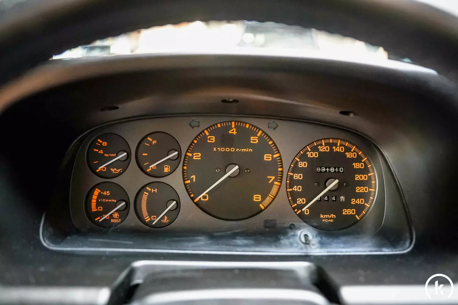 Auf schwarzen Zifferblättern stehen orangene Markierungen: Der Drehzahlmesser befindet sich mittig angeordnet, der Geschwindigkeitsmesser mit integriertem Tachometer sitzt rechts davon und zeigt eine Laufleistung von lediglich 31.810 Kilometern an – diese Kilometerleistung kann via teilweise abgestempeltem Scheckheft nachvollzogen werden. Alle Anzeigen und Instrumente gehen einwandfrei ihrem Dienst nach.