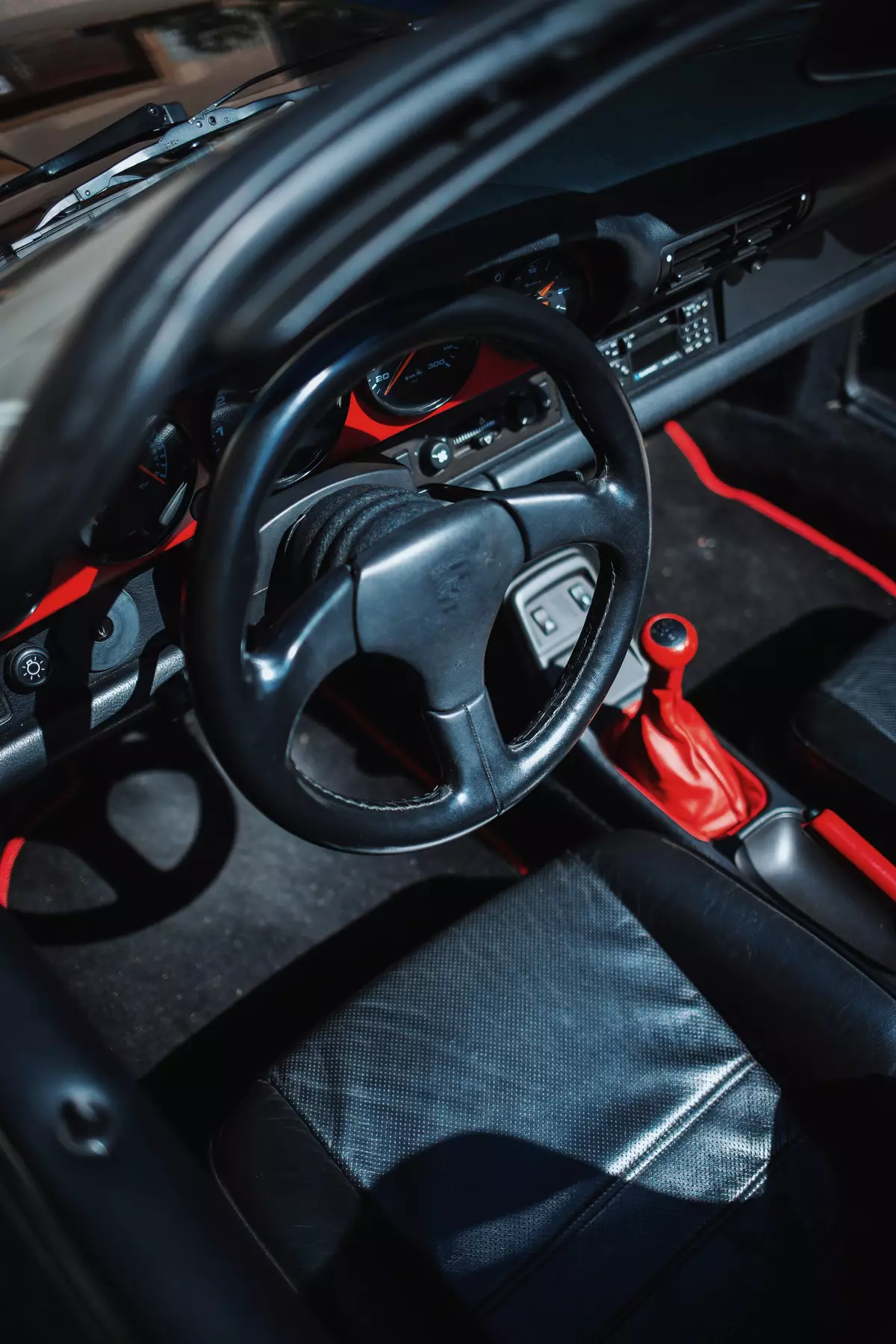 Im Interieur des Speedster befinden sich schwarze Vollledersportsitze, auffällig gibt sich die in Rot lackierte Armaturentafel sowie die weiteren in Rot abgesetzten Elemente im Innenraum. Bis auf minimale Gebrauchsspuren können im Inneren dieses Porsche 911 Carrera Speedster keinerlei Defizite vorgefunden werden, welche den überaus guten Gesamteindruck trüben könnten. Auf Airbags wurde beim Speedster verzichtet, als Ausstattungsmerkmalen ist folgendes an Bord dieses 964: Zentralverriegelung, elektrische Fensterheber, Servolenkung, Klimaanlage, Tempomat und ein Blaupunkt Kassettenradio. Die Mechanik des Verdecks arbeitet einwandfrei – es lässt sich einwandfrei entriegeln, öffnen und auch wieder schließen sowie verriegeln.