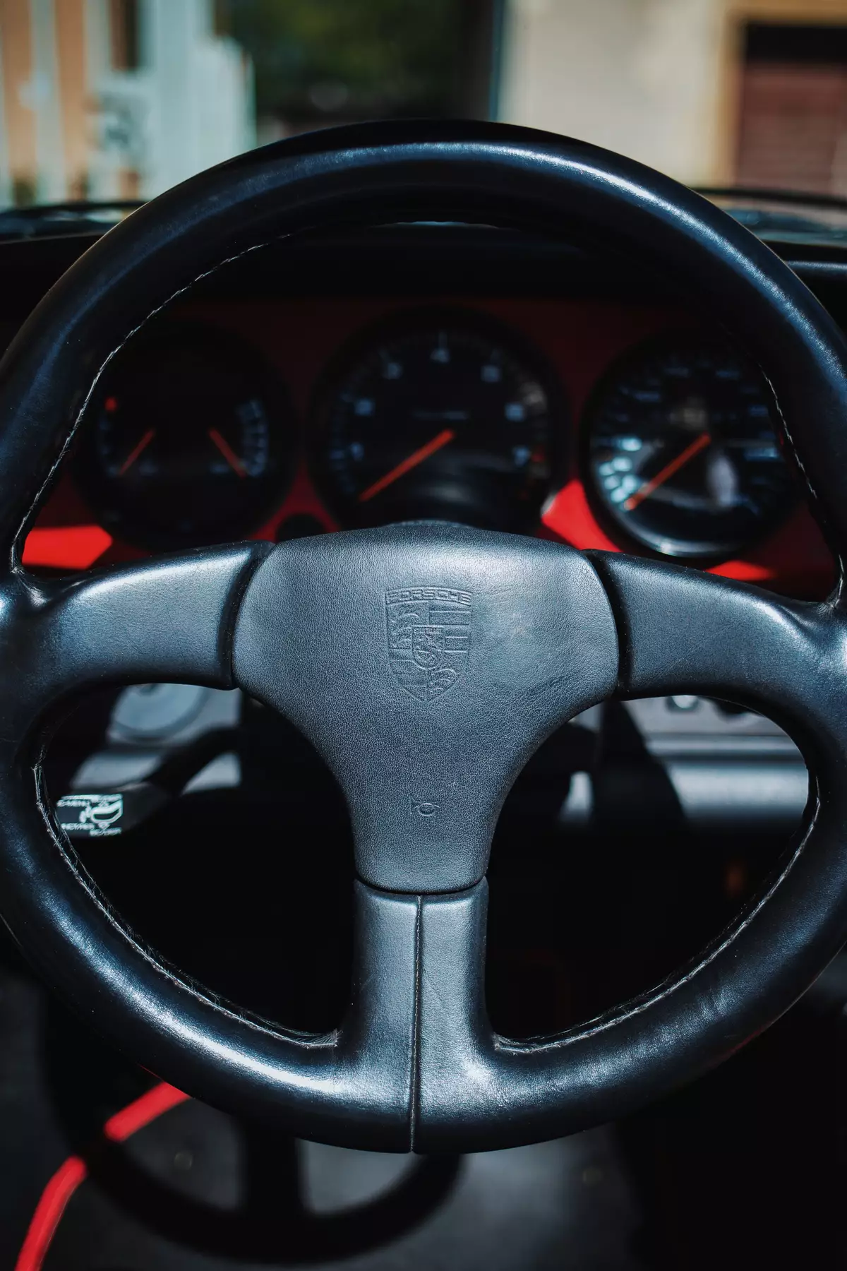 Die Porsche-typischen 5 Rundinstrumente bleiben auch beim Speedster in der Rot hinterlegten Armaturentafel bestehen: Am Tachometer ist eine Laufleistung von 91.810 Kilometern abzulesen. Ein teilweise geführtes Scheckheft sowie diverse ehemalige Rechnungen und Belege sorgen dafür, dass die Kilometerleistung dieses Speedster belegt werden kann. Allen Instrumenten und Bedienelementen im Innenraum kann eine einwandfreie Verfassung zugesprochen werden.