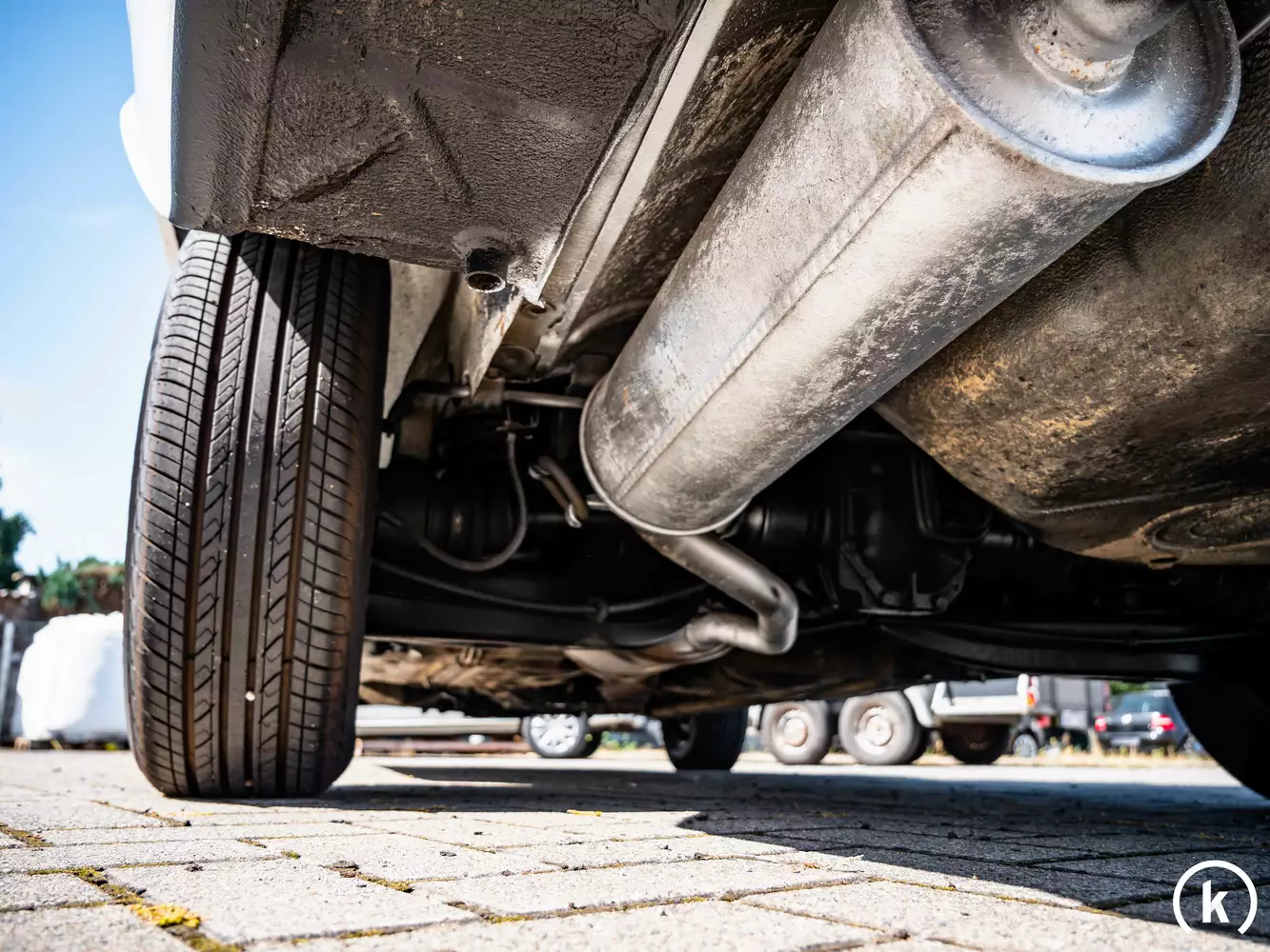 An der schönen, weißen Limousine sind Stahlfelgen mit original Mercedes Radkappen montiert. Die Felgen wurden im hinteren Bereich zum Teil unsachgemäß lackiert, befinden sich aber wie die Ovation Ecovision Reifen in einem guten Zustand. Das Fahrwerk ist voll intakt und seit der Auslieferung unverändert geblieben, an den Bremsen konnten beim letzten Service ebenfalls keine Mängel festgestellt werden.