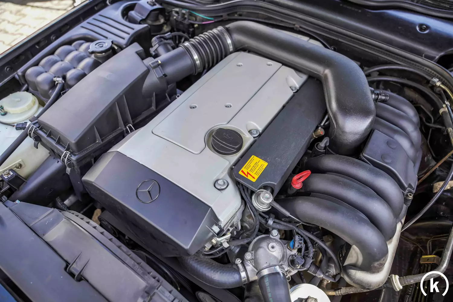 231 PS leistet der 3,2-Liter Reihensechszylindermotor im SL 320, geschaltet wird über ein 5-Gang Automatikgetriebe. Der Motorraum präsentiert sich sauber, ein letzter Service fand bei Kilometerstand 116.540 im Februar 2022 statt. Mängel in der Technik können nicht festgestellt werden.
