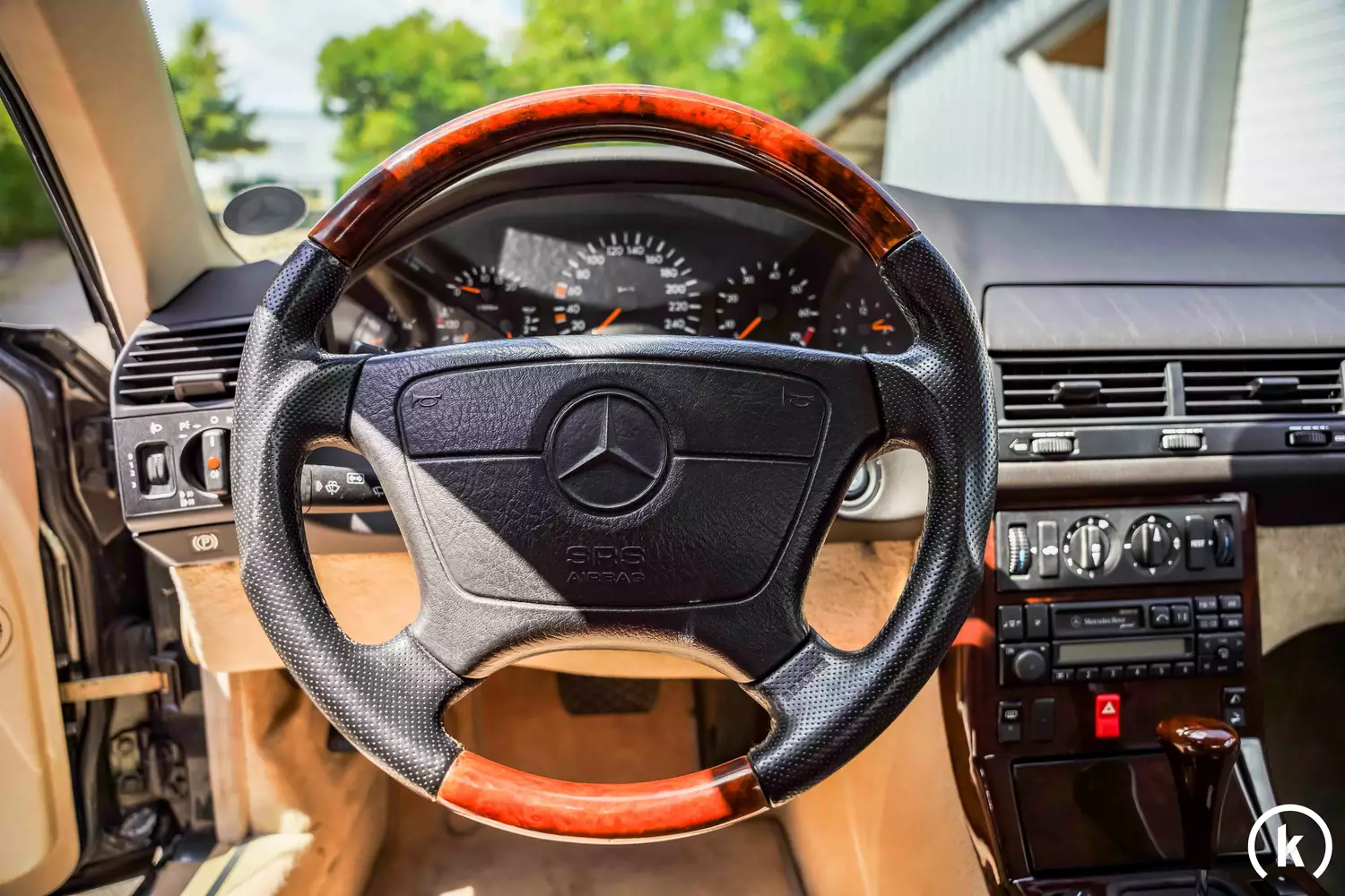 Fünf Rundinstrumente von schlichter Funktionalität befinden sich im Blickfeld des Fahrers: Der digitale Kilometerzähler zeigt eine Laufleistung von 118.500 Kilometern an. Die vollständige Bordmappe inklusive eines teilweise geführten Scheckhefts liegt vor – dadurch kann die Kilometerleistung des SL 320 belegt werden. Den Instrumenten im Innenraum ist eine einwandfreie Funktion zu attestieren.