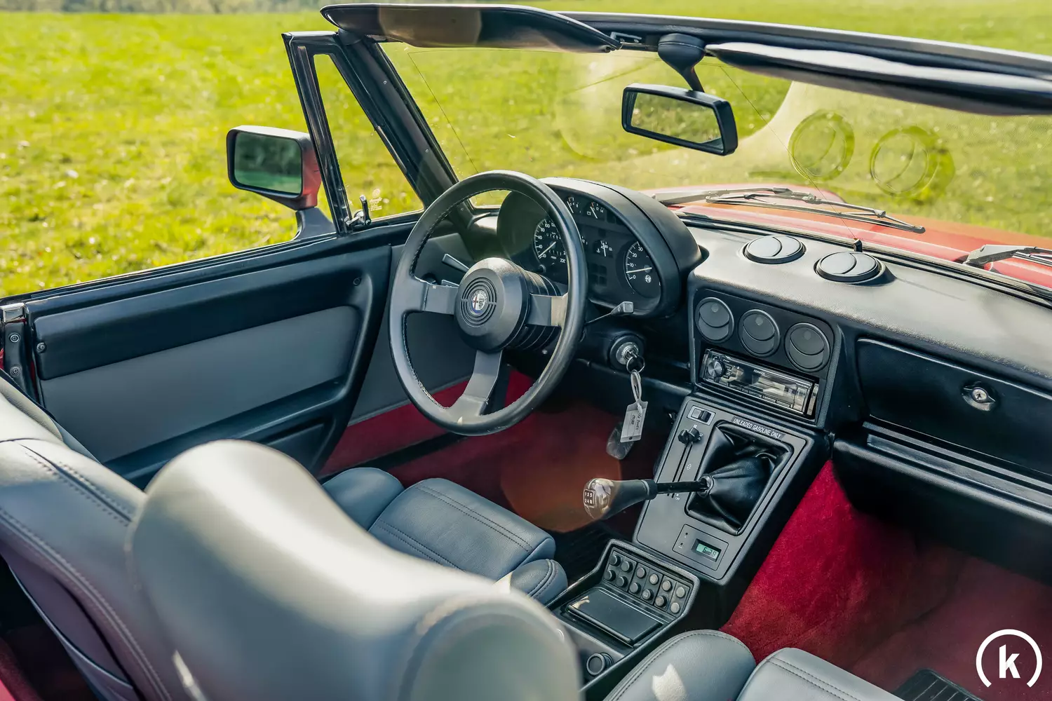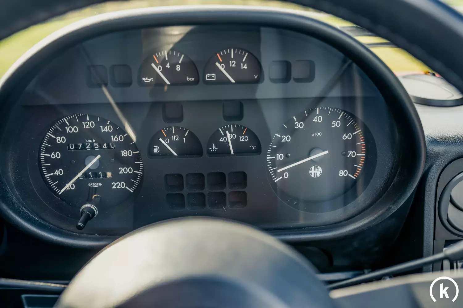 Am Tacho mit den Jaeger-Instrumenten sind dem Alfa Romeo 72.540 Kilometer abzulesen: Obwohl keine Historie zum Fahrzeug vorliegt, wirkt diese Laufleistung aufgrund des sehr guten Zustandes außen sowie innen durchaus glaubhaft. Die Funktion aller Instrumente im Innenraum ist vollständig gegeben.