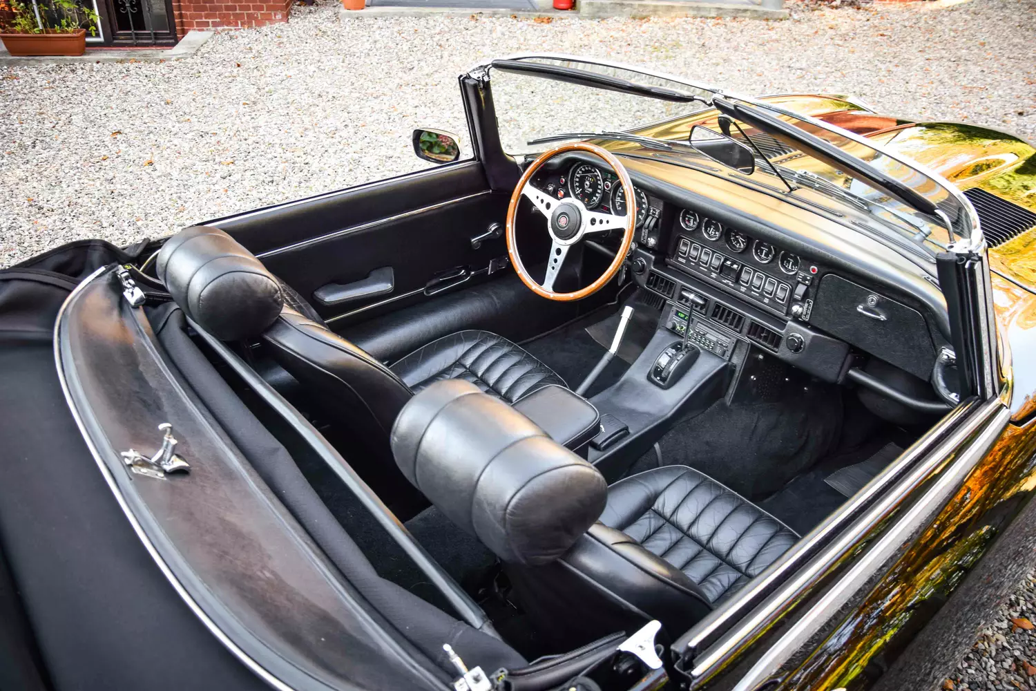 Im Innenraum des E-Type setzt sich der gute Zustand des Fahrzeugs in Form einer umfangreichen schwarzen Lederausstattung fort. Die Sitze des Briten zeigen sich augenscheinlich in gut erhaltenem Zustand. Laut Gutachten ist das Armaturenbrett zudem rissfrei. Zudem wurden einige Teile des Innenraums (Mittelkonsole und Klimakonsole), abweichend zum Originalzustand, mit einem schwarzen Lederbezug versehen. Schäden sind im Innenraum, den Angaben des Besitzers zufolge, nicht vorhanden. Zur Ausstattung zählen neben einem Faltdach, eine Servolenkung, ein Radio und eine Persenning. Hervorzuheben ist der Verbau eines neuen Verdecks sowie eine Sitzschienenverlängerung, sodass auch Fahrer über 1,90 m Körpergröße komfortabel Platz finden im Jaguar.