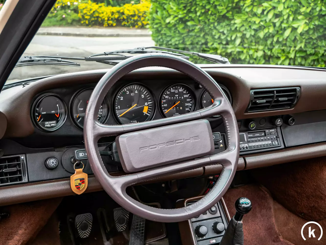 Ein überaus guter Zustand ist dem Interieur des Carrera 3.2 zu entnehmen: Beschädigungen im Innenraum sind offensichtlich nicht vorhanden, die braunen Ledersitze harmonieren außergewöhnlich gut mit der Außenfarbe sowie mit dem dunkelbraunen Verdeck. Die Farbe Braun ist am 4-Speichen Lederlenkrad und auch im fleckenfreien Fußraumteppich wiederzufinden, zudem ist das rissfreie Armaturenbrett auch in dieser Farbe gehalten. An Bord dieses Cabriolets sind ausstattungsmäßig folgende Merkmale zu nennen: Zentralverriegelung, elektrische Fensterheber, ABS und ein zeitgenössischer Kassettenradio Blaupunkt Bremen, welches voll funktionsfähig ist und mit einem versteckten Adapter auch Bluetooth-fähig gemacht wurde. Die Musikanlage wurde mit zeitgenössischen und passenden MB-Quart-Boxen in den Türen und im Font erweitert und mittel Verstärker und Subwoofer der Firma Alpine (jeweils unter den Vordersitzen) ergänzt und genügt selbst modernen und heutigen Hifi-Anforderungen. Zum einwandfrei funktionierenden manuellen Verdeck liegt eine dunkelbraune dazugehörige Persenning bei. Alle Instrumente, Schalter und Anzeigen im Interieur zeigen sich voll funktionsfähig.