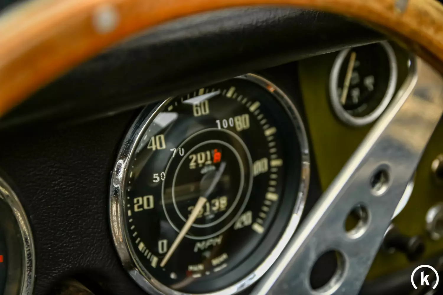 36.140 Meilen – also umgerechnet etwa 58.150 Kilometer – hat dieser TR3A auf dem Tacho stehen. Laut Verkäuferangaben kann diese Laufleistung durch die vorliegenden Unterlagen annähernd nachvollzogen werden. Bis auf die doppelte Öldruckanzeige funktionieren sämtliche Instrumente im Innenraum des TR3A problemlos.