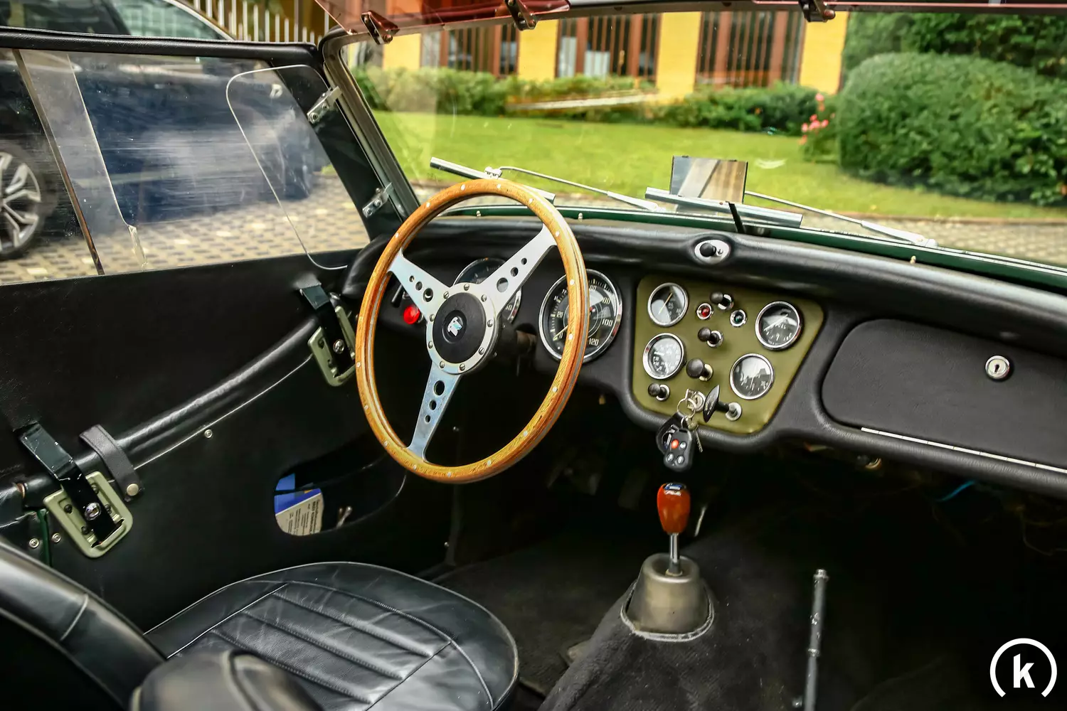 Sportlich geschnitten gibt sich das Interieur des Triumph TR3A: Die Vollledersitze sind in annehmbarer Verfassung vorzufinden und auch sonst kann dem Innenraum ein dem Fahrzeugalter entsprechend gutes Befinden zugesprochen werden. Als Mangel im Innenraum gibt der Verkäufer den sich lösenden Fußraumteppich an, des Weiteren wird das abschließbare Handschuhfach zusätzlich mit einem Seil stabilisiert. Folgende Merkmale sind an Bord dieses Triumph verbaut worden: Diebstahlwarnanlage, GPS Sender, Tripmaster „Terratrip 101“, Feuerlöscher unter dem Beifahrersitz, elektronische Lüftung und Sicherheitsgurte. Eine neuwertige Persenning liegt dem Wagen bei.