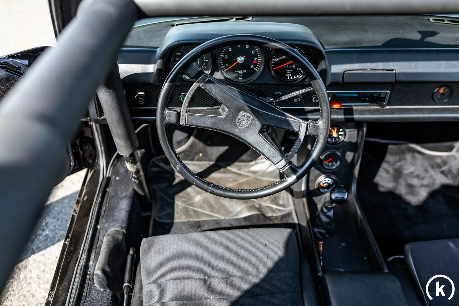 Dem Interieur sind schwarze Teilledersitze zu entnehmen, welche sich augenscheinlich in sauberem Erhaltungszustand befinden. Des Weiteren können keine Schäden im Innenraum dieses Porsche 914/6 vorgefunden werden – An manchen Stellen kann lediglich leichte Patina entdeckt werden. Als Modifikation im Inneren des Wagens ist ein schwarzer Überrollkäfig zu nennen. Die Fenster werden per Handkurbel betätigt und der Fahrer greift auf ein Vierspeichen-Lederlenkrad. Zudem befinden sich noch 3 Zusatzinstrumente in der Mittelkonsole des Porsche, ansonsten ist die Ausstattung dieses Fahrzeugs puristisch und aufs wesentliche reduziert gehalten.