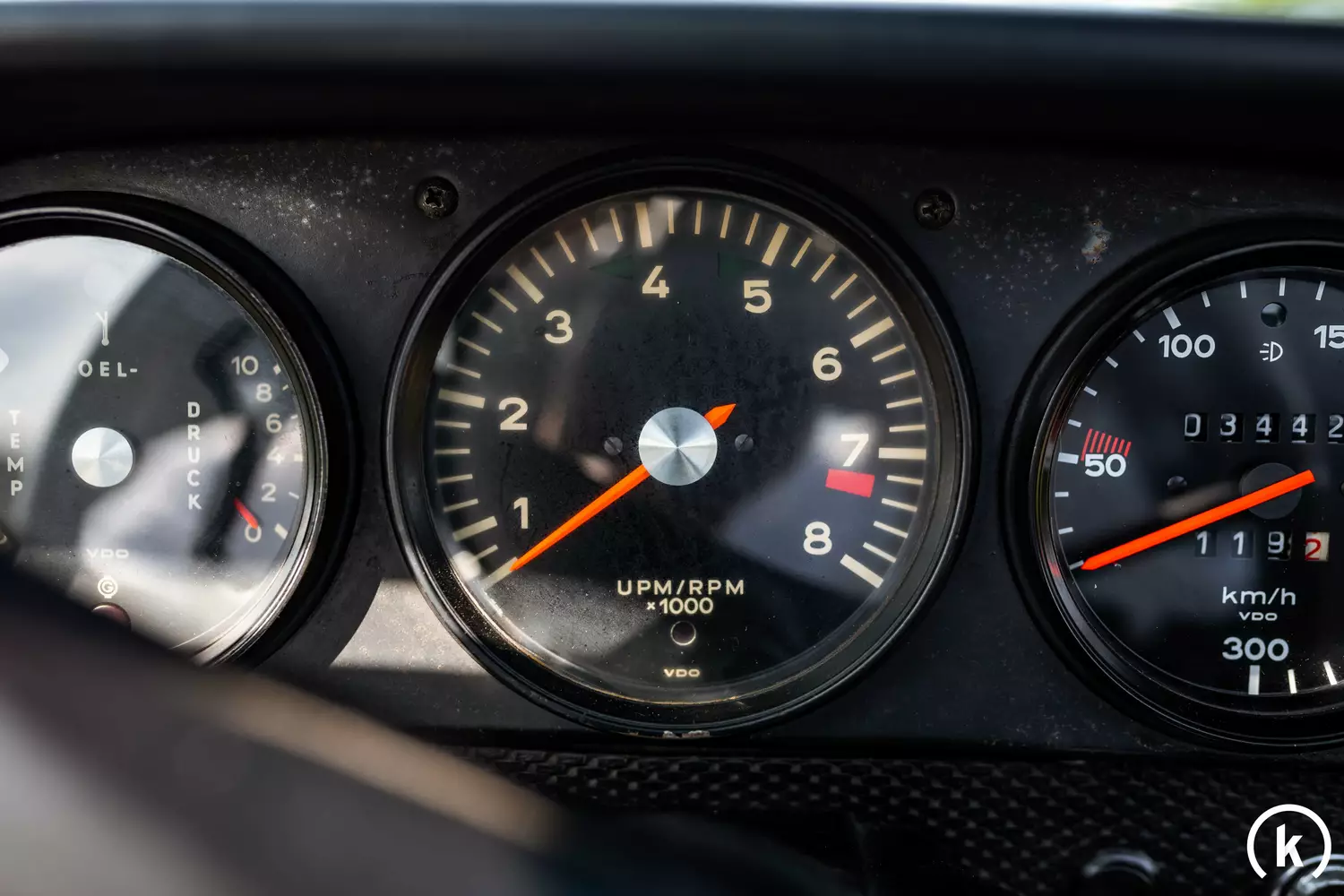 Im 914 befinden sich im Cockpit 3 Rundinstrumente: Rechts außen ist der Geschwindigkeitsmesser mit dem Tachometer zu finden. Am fünfstelligen Kilometerzähler ist eine Laufleistung von 3.442 Kilometern abzulesen. Dem jetzigen Halter zufolge soll dieser 914/6 insgesamt 105.000 Kilometer gelaufen haben. Alle Instrumente im Innenraum funktionieren tadellos.