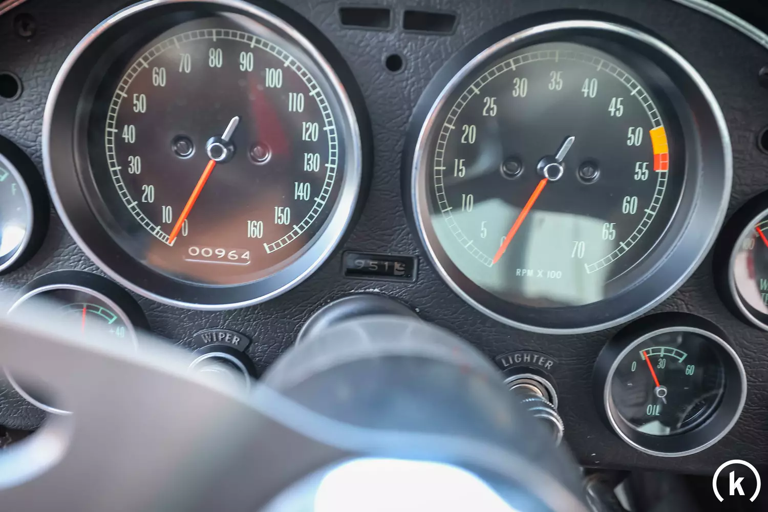 7 Rundinstrumente informieren den Corvette-Fahrer über alle wichtigen Daten, am 5-stelligen Tachometer kann eine Laufleistung von 964 Kilometern abgelesen werden. Der tatsächliche Kilometerstand ist dem momentanen Halter nicht mehr bekannt. Alle Anzeigen im Cockpit sind in einwandfrei funktionierender Verfassung erhalten.