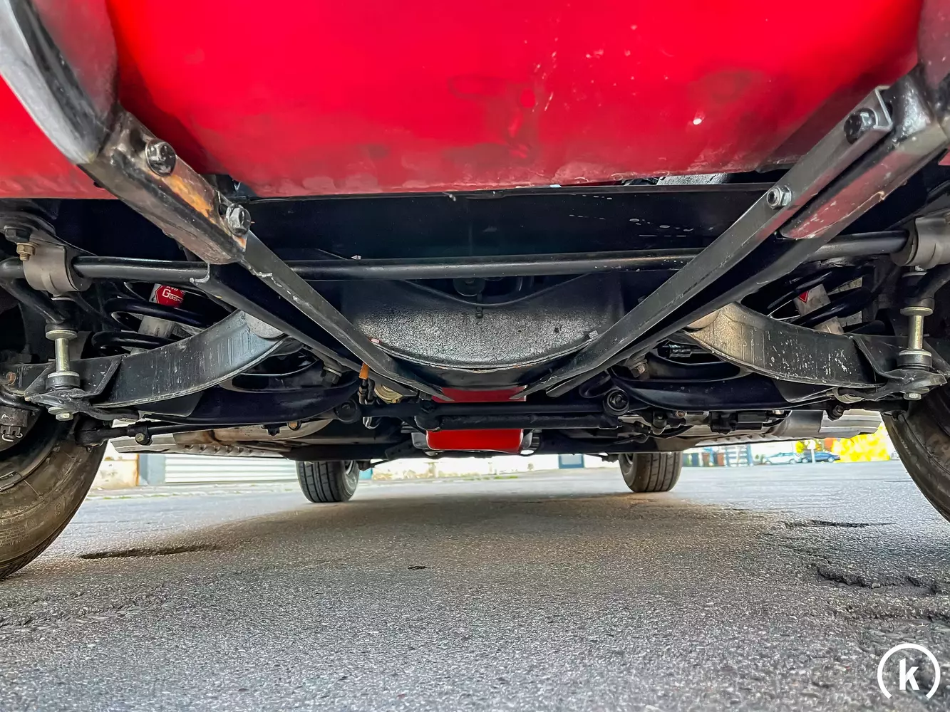Als Felgen dienen originale Corvette-Stahlfelgen in der Größe von 15 Zoll, auf denen Weißwandreifen in guter Verfassung mit ausreichend Profil aufgezogen sind. Ebenfalls in guter Verfassung befindet sich dem Verkäufer zufolge die Bremsanlage. Dem Fahrwerk können offensichtlich keine Defizite entnommen werden.