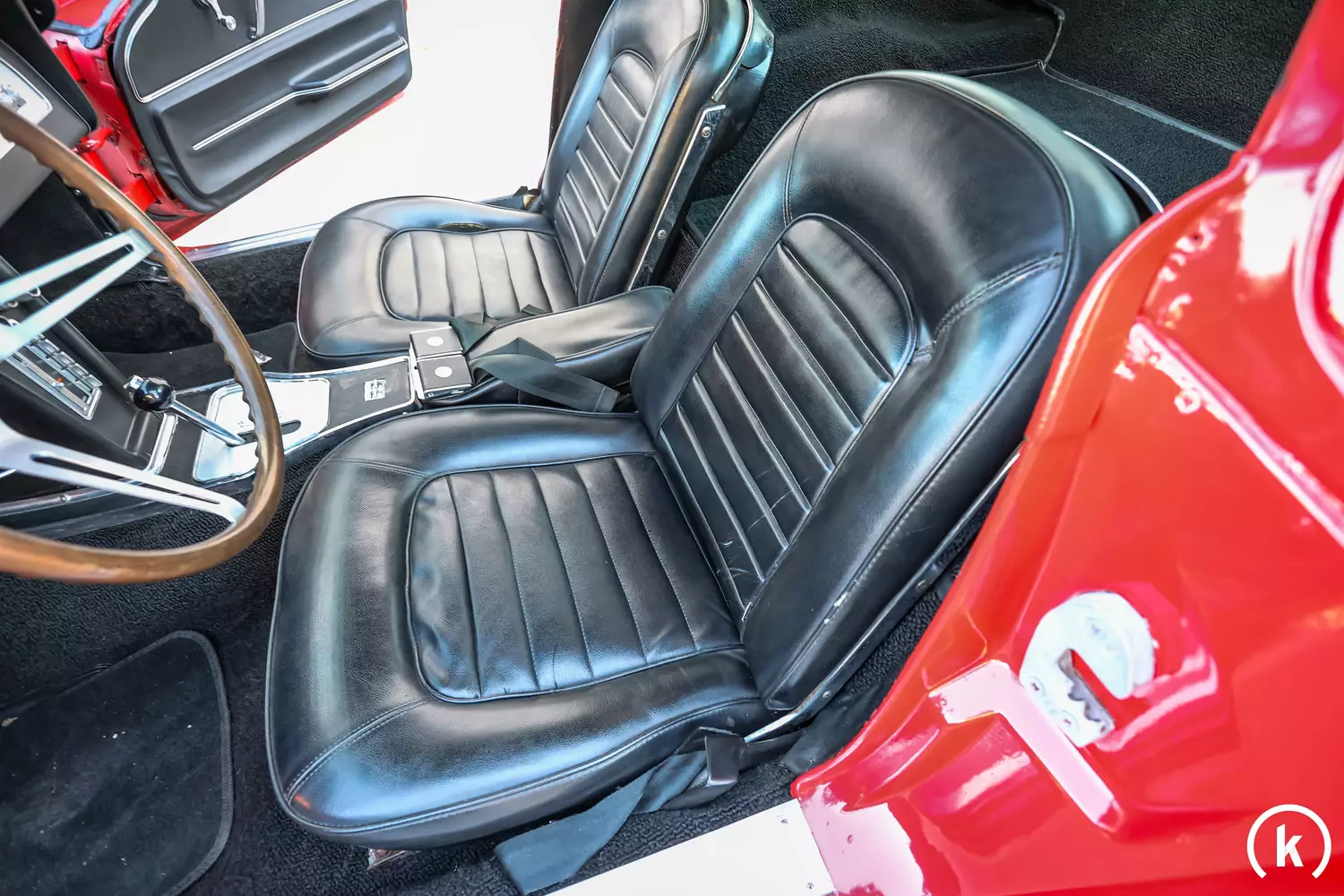 Schwarze Kunstledersitze sind im Interieur dieser Corvette C2 vorzufinden: Der Fahrer greift auf ein 3-Speichen Holzlenkrad. Zwar ist ein Riss im Beifahrersitz erkennbar und das Armaturenbrett könnte laut Verkäuferangaben erneuert werden, aber im Großen und Ganzen zeigen sich Türtafeln, Innenraumteppich, Dachhimmel sowie die restlichen Innenraumelemente in einem gepflegten Erhaltungszustand. Servolenkung und ein Radio zählen zum Ausstattungsumfang, die Fensterheber werden per Handkurbel betätigt. Sämtliche Bedienelemente wie das originale Radio oder die Heizung sowie das Gebläse funktionieren tadellos.