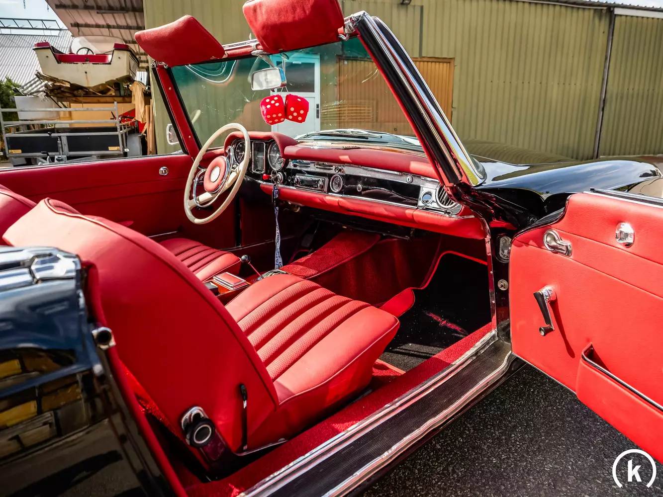 In diesem Monat erst wurde nahezu der gesamte Innenraum dieses 230Sl neu aufgebaut: Dabei kamen Leder, Teppich, Armaturenbrett, Chrom im Interieur neu und der gesamte Kofferraum wurde komplett neu ausgelegt. Das stilvolle SL-Interieur des W 113 überzeugt durch den einwandfreien Gesamtzustand ohne jegliche Abnutzungsspuren. Im Kontrast zum roten Leder steht das elfenbeinfarbene 2-Speichen Lenkrad. Als Ausstattungsmerkmale befindet sich eine Servolenkung sowie ein Pioneer Zubehörradio mit hinter den Sitzen verbauten Lautsprecherboxen an Bord des SL. Weiters liegt noch ein Hardtop bei. Problemlos zu bedienen ist die Verdeckmechanik, welche sich in sauberer Verfassung befindet. Ebenso problemlos funktionieren sämtliche Bedienelemente und Anzeigen im Innenraum dieses 230SL.