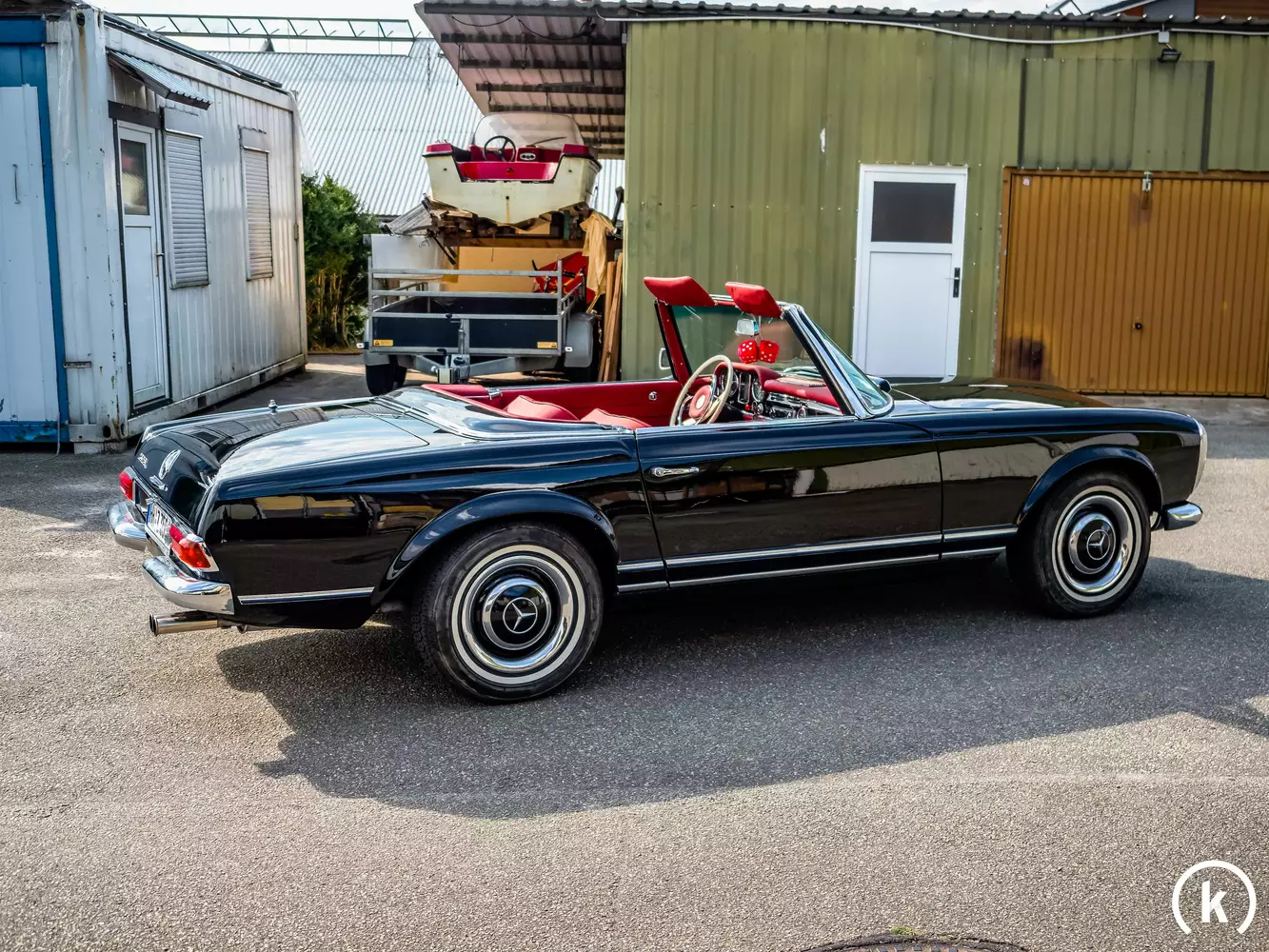 Mängel am Exterieur können aufgrund der erst kürzlich durchgeführten Teilrestaurierung des Mercedes-Benz keine vorgefunden werden – da diese Pagode laut Verkäuferaussagen karosserietechnisch in den Genuss eines Neuaufbaus gekommen ist. Am schwarzen Lack sind keinerlei Korrosionsspuren oder sonstige Defizite wie Farbunterschiede oder Dellen zu entdecken, auch sämtlicher Chromzierrat zeigt sich in tadellos glänzender Verfassung. Der Verkäufer lässt erwähnen, dass der Lack erst frisch versiegelt wurde. Farblich perfekt auf die Innenausstattung abgestimmt ist das rote Verdeck: Dieses weist weder Risse im Stoff noch in der Heckscheibe auf und ist erst vor kurzem erneuert worden. Einen Unfallschaden kann der Besitzer in seiner Haltedauer ausschließen.