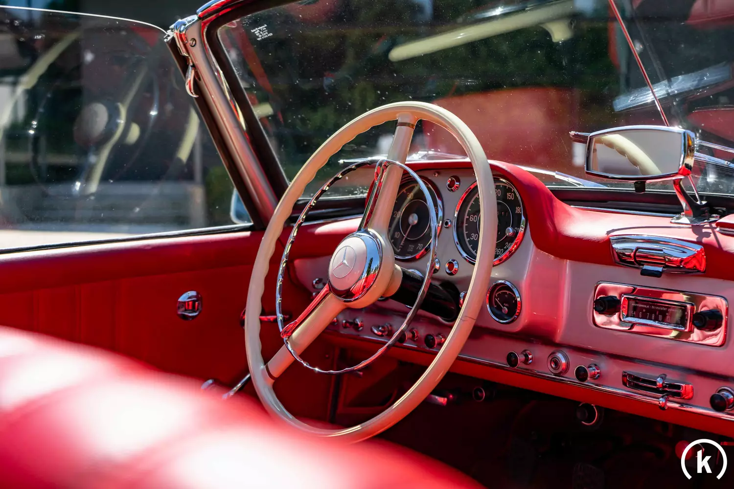 Luxuriös ausgestattet präsentiert sich der Innenraum des 190 SL welcher sich im Falle dieses Wagens durch eine rote Innenausstattung mit Elfenbeinfarbenen Lenkrad äußert. Die roten Ledersitze zeigen sich dick gepolstert und in einwandfreier Verfassung, auch die Türtafeln, das Armaturenbrett, der Fußraumteppich und sämtliche Bedienelemente im Interieur des Mercedes-Benz überzeugen durch ihren tadellosen Zustand. Nirgends können Beschädigungen oder gar Fehlteile beanstandet werden. Zur Ausstattung dieses 190 SL zählen neben dem glamourösen Zweispeichen-Lenkrad mit Chromhupring unter anderem die für Fahrer und Beifahrer getrennt einstellbare Heizungsregelung mit Zusatzlüfter für das Entfrosten der Scheiben sowie eine Persenning und ein Motorola Radio.