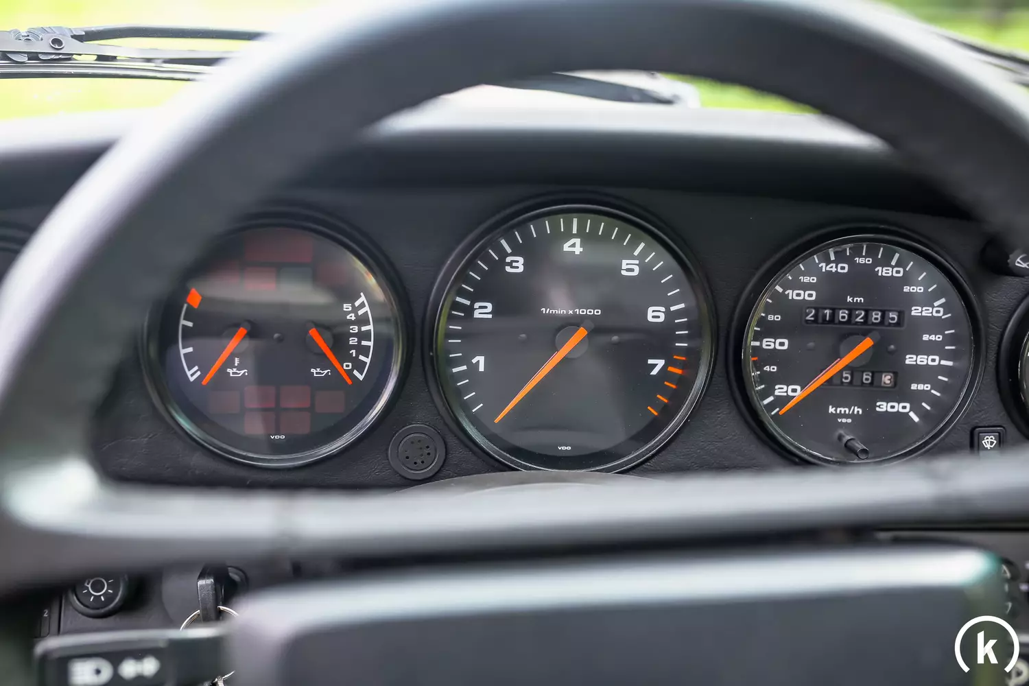 Die Porsche-typischen 5 Rundinstrumente besitzt auch der 964: Am Tachometer kann eine Laufleistung von 216.290 Kilometer abgelesen werden. Teilweise wurde das beiliegende Porsche-Serviceheft geführt – der Kilometerstand und somit die Geschichte dieses Carrera 4 kann zusätzlich durch diverse ehemalige Rechnungen und TÜV-Berichte zurückverfolgt werden.