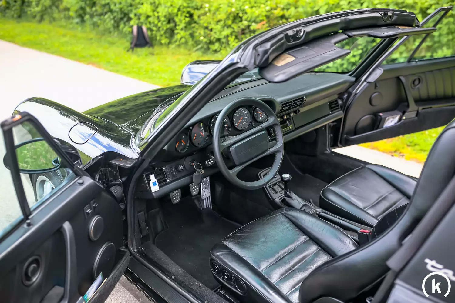Guten Komfort bieten die Vollledersitze des 964: Bis auf eine leichte Patina im Interieur dieses Sportwagens können keine Beschädigungen, Fehlteile oder sonstige Schäden entnommen werden. Für Frischluftzufuhr wird vor allem dann gesorgt, wenn man das Targadach aus der Verankerung nimmt und verstaut: Dabei lässt sich der abnehmbare Dachmittelteil leicht entfernen und auch beim Einsetzen gelingt der Vorgang mit Leichtigkeit und ohne Probleme. Zur Ausstattung dieses 911 zählen unter anderem: Servolenkung, Zentralverriegelung, elektrische Fensterheber, elektrische Sitzverstellung, Sitzheizung, Klimaanlage, ABS und ein Sony Zubehörradio. Sämtliche Schalter, Hebel, Anzeigen und Instrumente im Innenraum dieses 911 sind voll funktionsfähig.