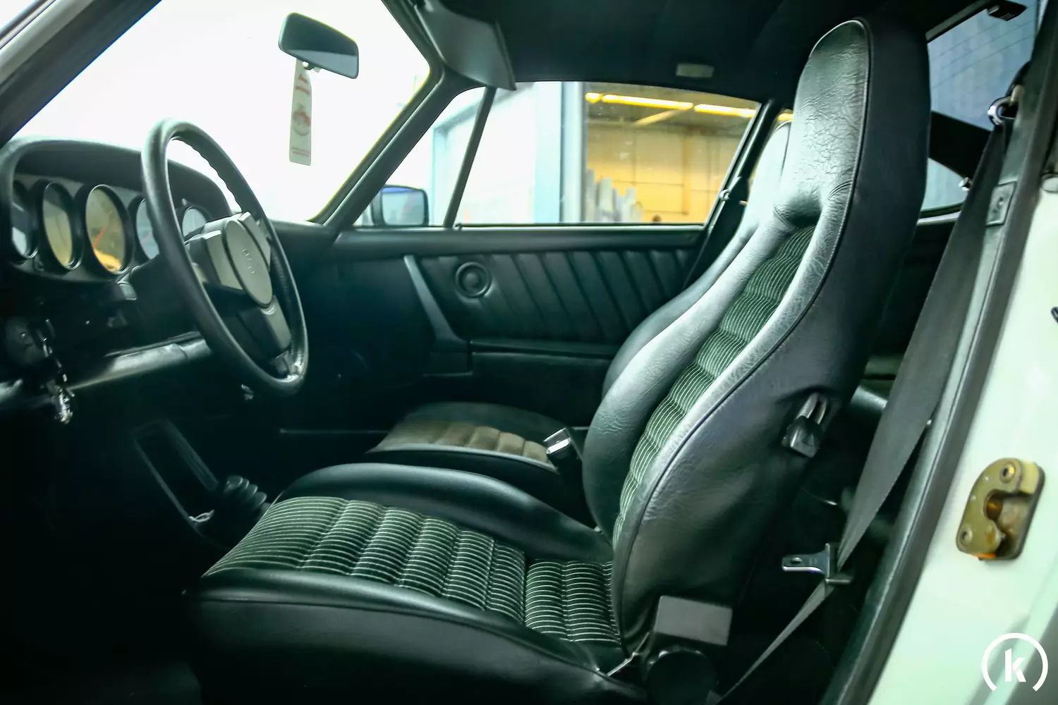 Als Innenausstattung besitzt der Elfer Sitze in schwarzem Teilleder mit Nadelstreifen-Muster. Im Interieur zeigt sich dieser Porsche in einem hervorragenden Erhaltungszustand, da keine Beschädigungen erkannt werden können. Armaturen, Schalter, Hebel und alle weiteren Bedienelemente überzeugen durch ihre tadellose Funktionalität. Zur Ausstattung zählen ein Radio, elektrische Fensterheber und ein Dreispeichen-Sportlenkrad. Abweichungen vom Originalzustand können im Interieur dieses 911 keine vorgefunden werden.