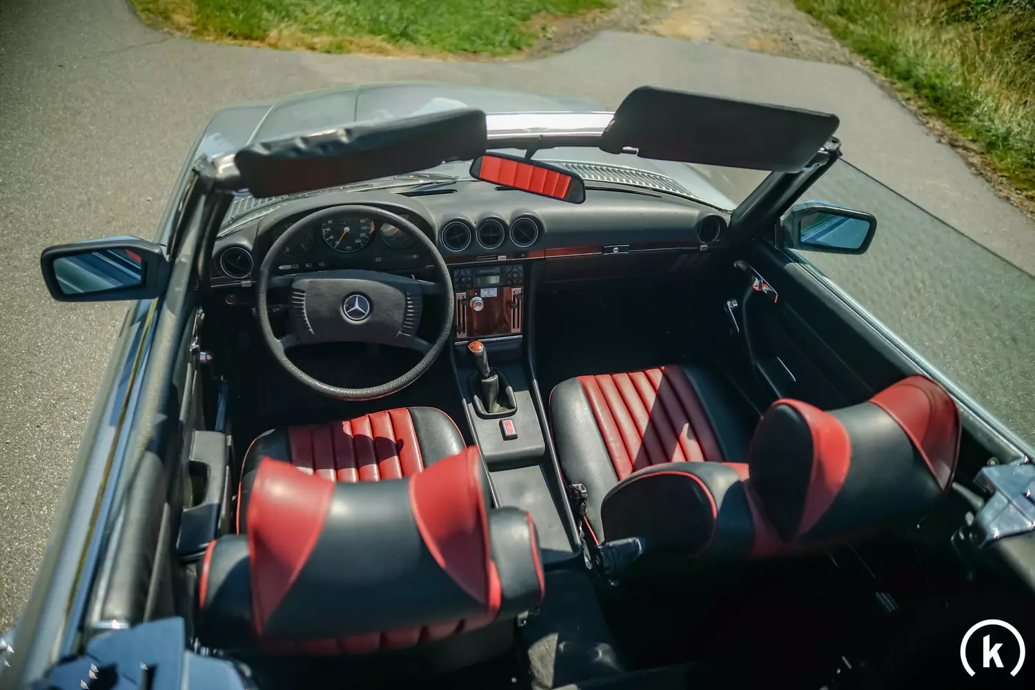 Im Interieur entschied man sich bei den Restaurationsarbeiten für eine Erneuerung der Ledersitze in den Farben Rot und Schwarz. Ein paar Veränderungen abweichend vom Originalzustand wurden augenscheinlich im Innenraum dieses 280 SL vorgenommen, jedoch finden sich keinerlei Beschädigungen im Inneren des Mercedes-Benz. Das schwarze Stoffverdeck lässt sich problemlos bedienen. Zur Ausstattung des R 107 zählen eine Servolenkung und ein Mercedes-Benz Kassettenradio mit Zusatzlautsprechern hinter den Sitzen. Allen Instrumenten, Schaltern und Anzeigen im Innenraum kann eine einwandfreie Funktion attestiert werden.