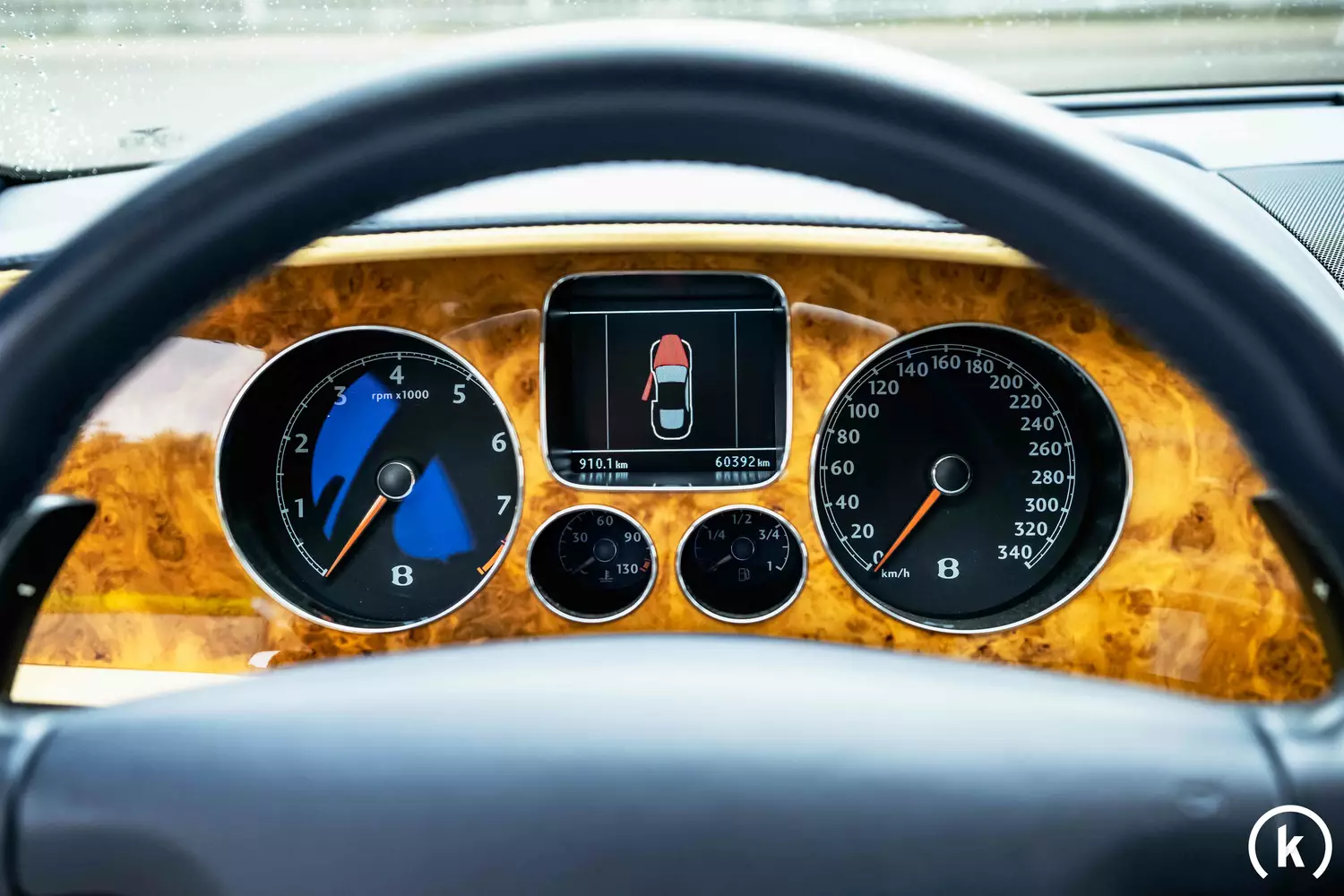 In Chrom gefasste und schnörkellos erscheinende Rundinstrumente sind in der Tachoeinheit zu erblicken: Die Gesamtlaufleistung des Bentley Continental GT beträgt abgelesene 60.400 Kilometer. Diese Laufleistung ist durch ein teilweise geführtes Scheckheft zu belegen. Weiters auffällig ist die einwandfreie Funktion aller Instrumente und Anzeigen im Innenraum.