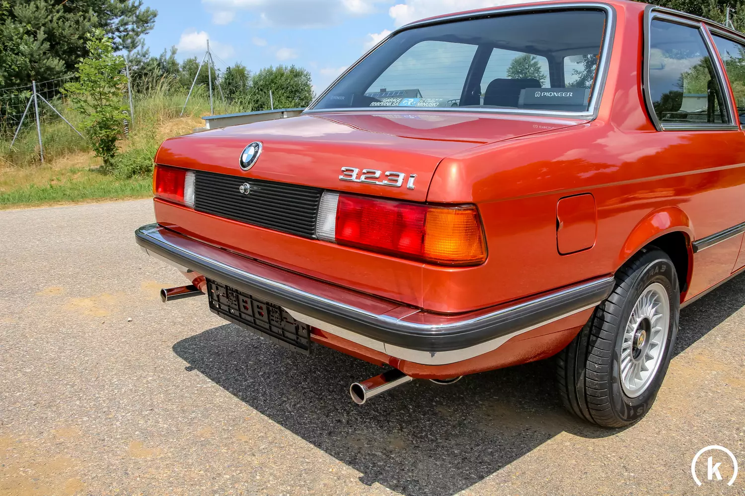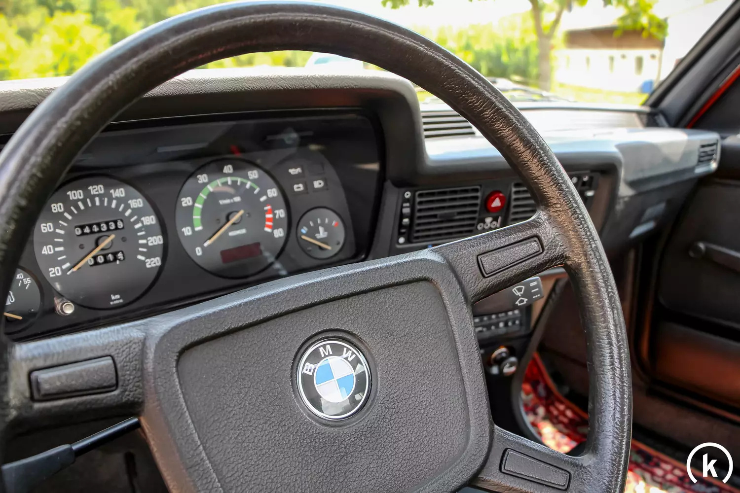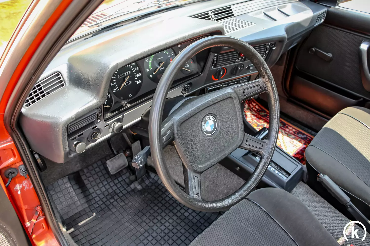 Bis auf Nachlackierungen im Bereich der Dachaußenhaut und der Neulackierung des Heckblechs besticht dieser 323i in der Lackfarbe namens „Kastanienrot-Metallic“ durch seinen Erstlack. Aufgrund des größtenteils ersten Lackkleides dieses E21 sind natürlich kleinere Gebrauchsspuren sowie Spuren der Zeit an der Karosserie nicht einfach vorübergegangen – aber es ist zu erwähnen, dass sich das Exterieur des BMW angesichts dessen in einem äußerst guten Erhaltungszustand ohne Rostschäden befindet. Auch das Chrom glänzt noch so wie es soll und sämtliche Kunststoffelemente am Fahrzeug sind in unbeschädigter Verfassung erhalten. Zudem sind keinerlei Modifikationen am Exterieur abweichend vom Originalzustand festzustellen. Einen Unfall kann der Verkäufer im jetzigen Besitz ausschließen.
