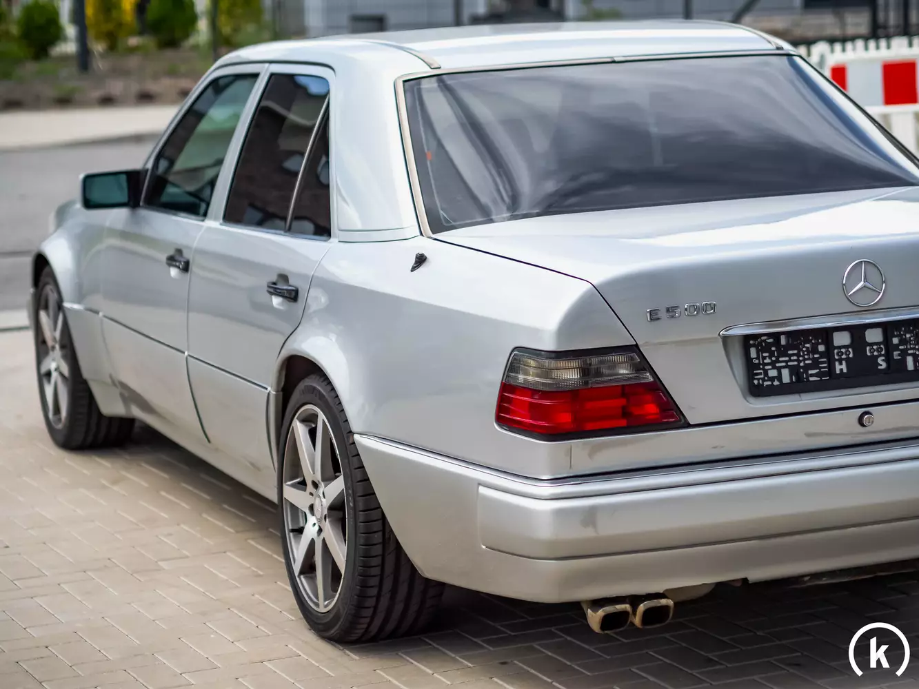 Optisch unaufgeregt und für Nicht-Kenner des E 500 kaum von der normalen W 124 Limousine zu unterscheiden, kommt das Aussehen des V8-Boliden daher. Nur ein Modellschriftzug am Heckdeckel und die Verbreiterung der Vorderkotflügel verraten annähernd die Kraft dieses E 500. Bei diesem Wagen ist zusätzlich eine Sportabgasanlage verbaut, welche den Klang des V8-Motors besser hören lässt. Nachlackierungen im Originalfarbton namens „Brillantsilber-Metallic“ fanden laut Verkäuferaussagen an mehreren Bauteilen und der Stoßstange statt. Als äußerlichen Mangel gibt der momentane Besitzer ein paar Kratzer an den Stoßfängern an, ansonsten präsentiert sich dieser E 500 dem Alter entsprechend in einem guten Zustand. Rost an der gesamten Karosserie kann augenscheinlich keiner vorgefunden werden. Einen Unfall schließt der jetzige Besitzer in seiner Haltedauer aus.