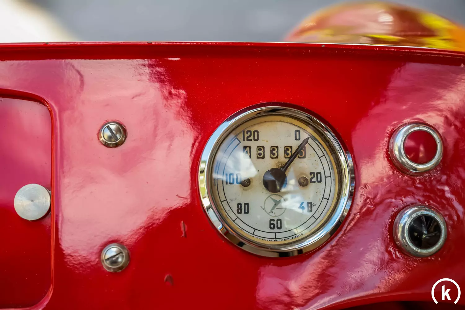 Hinter dem Lenker sind im Blech 2 Instrumente untergebracht: Eine Uhr sowie ein Geschwindigkeitsmesser mit integriertem Wegstreckenzähler. 48.340 Kilometer sind darauf abzulesen – durch diverse Unterlagen kann die Geschichte dieses KR 200 annähernd nachvollzogen werden. Allen Instrumenten und Anzeigen im Innenraum ist eine problemlose Funktion zu attestieren.