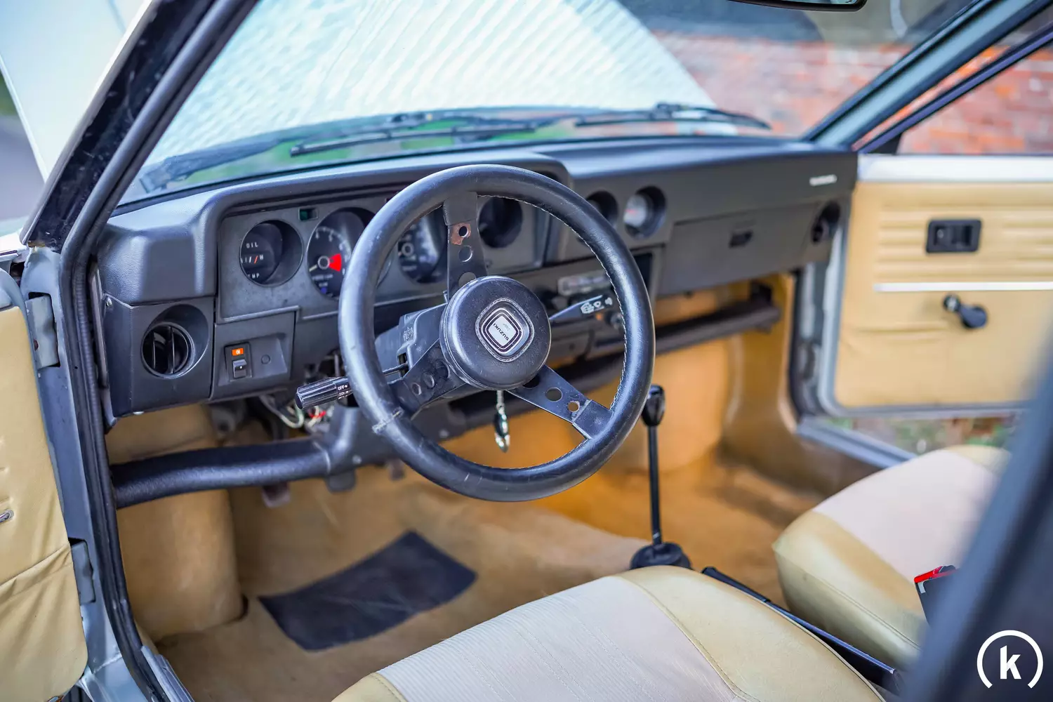 Der Innenbereich ist mit hellbraunem Teppich ausgekleidet, die dazu passenden Sitze nutzen eine Kombination aus Leder und weißem Stoff. Das hellbraune Leder ist ebenso an der Innentürverkleidung zu finden, von einigen kleineren Schäden an den Nähten der Sessel abgesehen ist das Interieur in einem sehr gepflegten Zustand erhalten geblieben. Das Armaturenbrett präsentiert sich aufpoliert in klassischem Schwarz und weist keine Blessuren auf, neben Anzeigen und Bedienelementen verfügt das Fahrzeug über ein mit Leder bezogenes Sportlenkrad und ein Radio.