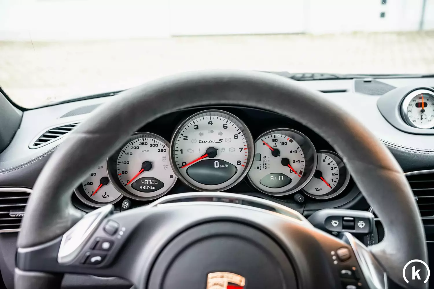 Im Vergleich zum 996 komplett neu gestaltet präsentiert sich der Innenraum des 997 mit modernen, geradlinigen Knöpfen und Schaltern. Volllederschalensitze mit „speedgelben“ Gurten sorgen für Motorsport-Feeling und zeigen sich nicht abgenutzt, des Weiteren sind auch noch das 3-Speichen Lenkrad und der Schaltknauf nicht sonderlich von Gebrauch gezeichnet. Beschädigungen oder gar Fehlteile im Interieur dieses Turbo S können nicht beanstandet werden. Neben der reichhaltigen Serienausstattung und dem Sport Chrono Paket sind in diesem Turbo S noch folgende Individualisierungen vorgenommen worden: Deckel Ablagefach Alcantara mir Porsche Schriftzug, HomeLink (Garagentoröffner, Multifunktionslenkrad, Park Assistent (hinten), Sitzheizung, Türeinstiegsblenden aus Karbon beleuchtet, Telefonmodul.