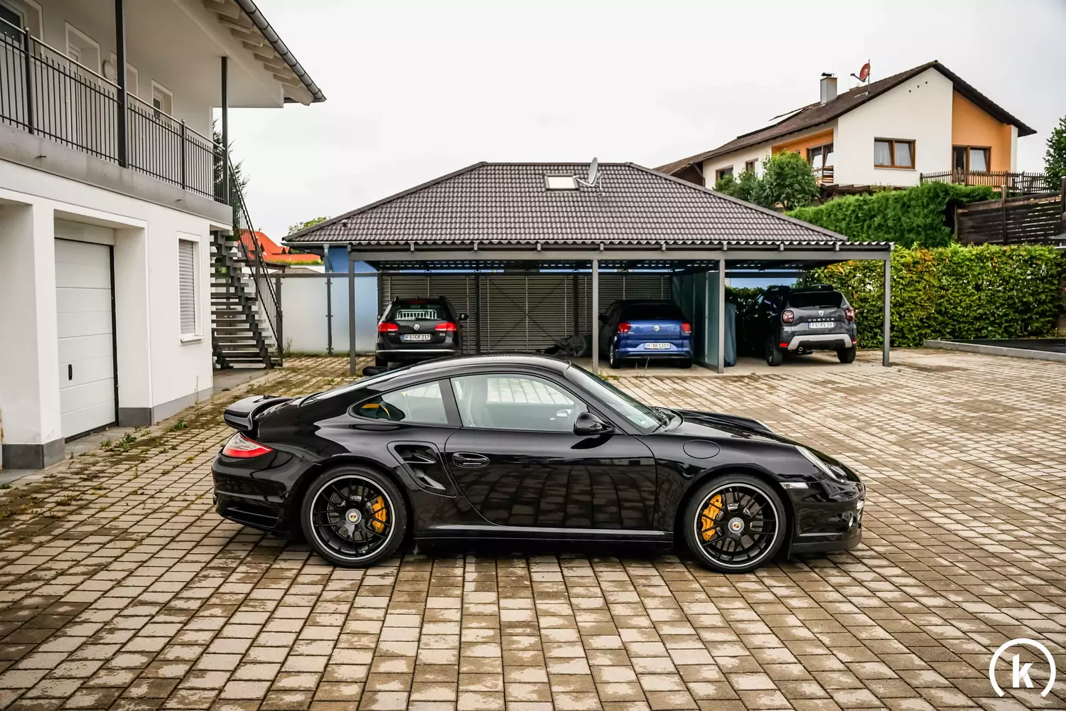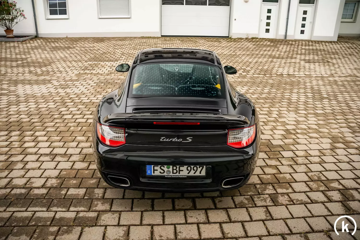 Für das erweiterte optische Erscheinungsbild neben der in Schwarz-Metallic lackierten Karosserie sorgen die dazu passenden, originalen in Schwarz lackierten 19 Zoll großen Turbo GTS Felgen, auf denen Reifen in gutem Zustand montiert sind. Serienmäßig an Bord des Turbo S sind die Porsche Ceramic Composite Bremsen, welche sich anhand der in gelb lackierten Bremssättel identifizieren lassen. Fahrwerkstechnisch können augenscheinlich keinerlei Defizite bei diesem 997 ausgemacht werden.