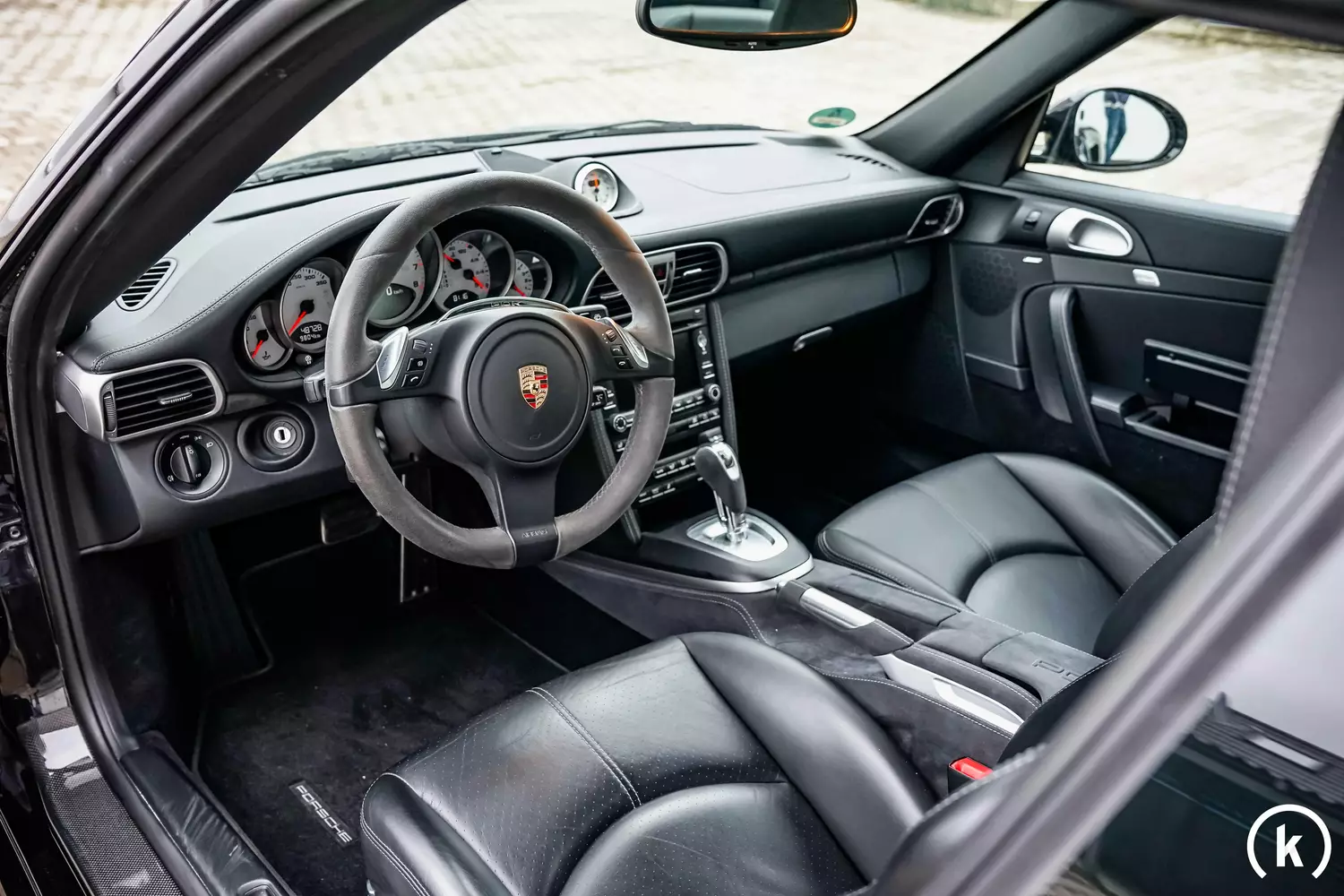 Im Vergleich zum 996 komplett neu gestaltet präsentiert sich der Innenraum des 997 mit modernen, geradlinigen Knöpfen und Schaltern. Volllederschalensitze mit „speedgelben“ Gurten sorgen für Motorsport-Feeling und zeigen sich nicht abgenutzt, des Weiteren sind auch noch das 3-Speichen Lenkrad und der Schaltknauf nicht sonderlich von Gebrauch gezeichnet. Beschädigungen oder gar Fehlteile im Interieur dieses Turbo S können nicht beanstandet werden. Neben der reichhaltigen Serienausstattung und dem Sport Chrono Paket sind in diesem Turbo S noch folgende Individualisierungen vorgenommen worden: Deckel Ablagefach Alcantara mir Porsche Schriftzug, HomeLink (Garagentoröffner, Multifunktionslenkrad, Park Assistent (hinten), Sitzheizung, Türeinstiegsblenden aus Karbon beleuchtet, Telefonmodul.