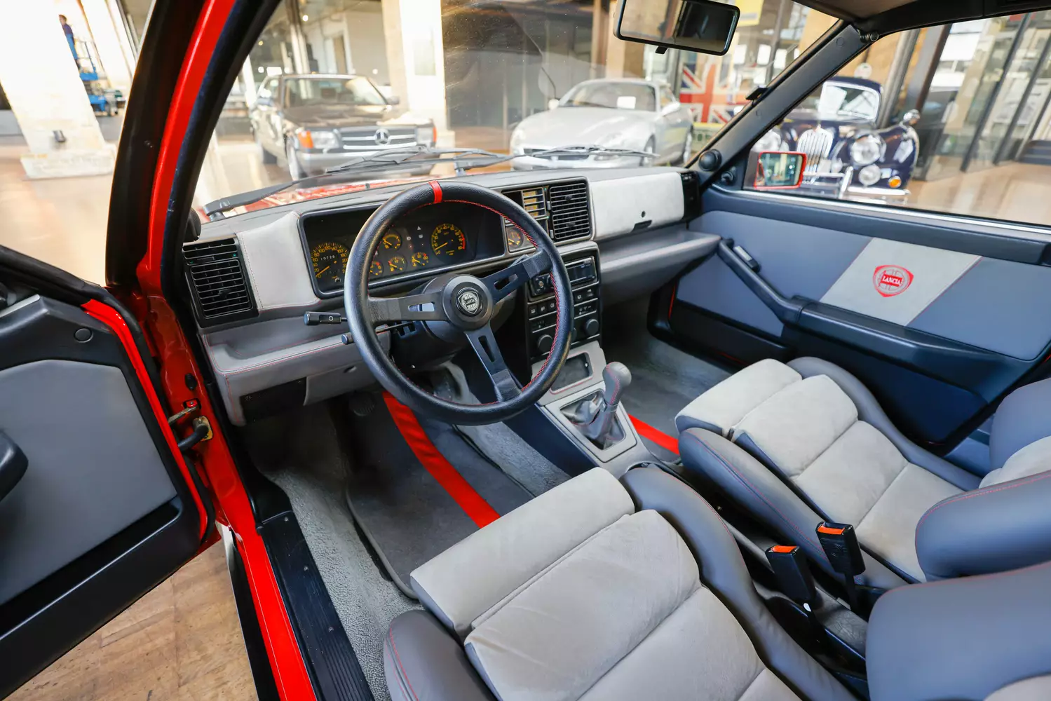 Der Innenraum des Integrale ist in grau gehalten. Sowohl die Alcantara- bzw. Lederbezüge an den Sitzen und Seitenverkleidungen, als auch die farblich abgesetzten roten Stickereien und Nähte wirken sehr gepflegt. Die Recaro-Sportsitze weisen augenscheinlich weder im Bereich des Fahrer- noch des Beifahrersitzes Abnutzungserscheinungen auf. Auch im Bereich der Mittelkonsole und der Armaturen wurde der Lancia mit Leder ausgestattet, welches ebenfalls gepflegt wirkt. Das nachgerüstete Pioneer-Radio sorgt für die akustische Untermalung, auch hier sind keine Mängel bekannt.