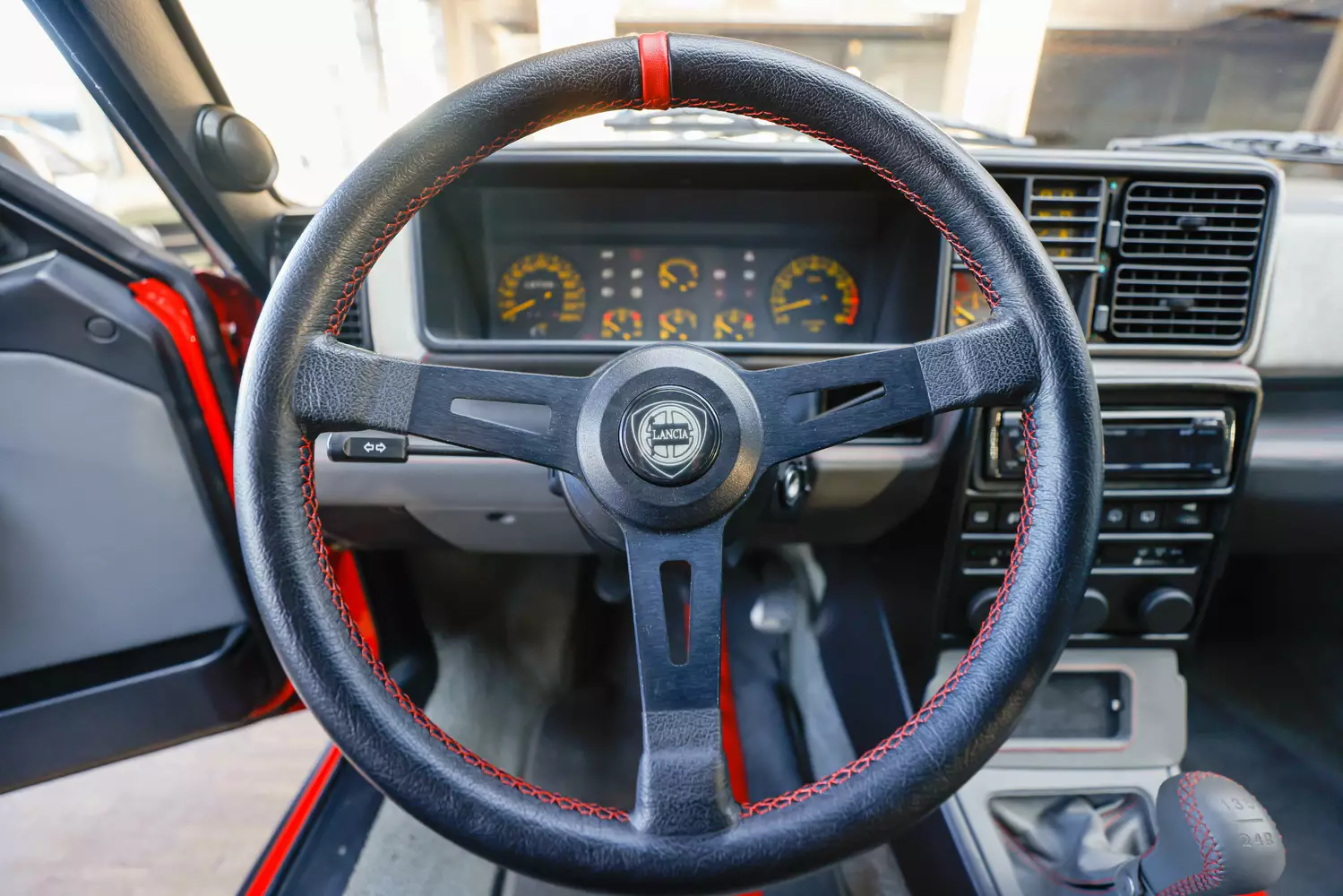 Beim Blick hinter das Dreispeichen-Sportlenkrad auf die aufgeräumten Instrumente des Lancias lässt sich eine Laufleistung von 107.244km ablesen, welche durch vorhandene Rechnungen und TüV-Berichte teilweise nachvollziehbar ist. Die Instrumente funktionieren laut Verkäuferangaben mängelfrei. Elektrische Fensterheber, Servolenkung und Zentralverriegelung gehören neben der Colorverglasung zu der weiteren Ausstattung des Lancia.