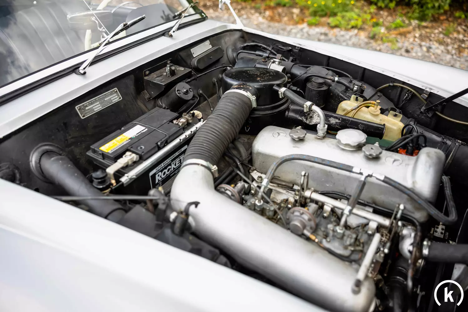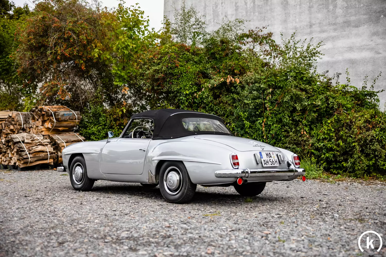 Ein 190 SL trägt das „Flügeltürer-Gesicht“ samt Falzen entlang der vorderen und hinteren Kotflügel oberhalb der Radauschnitte. Karosseriefarbtechnisch war dieser 190 SL Roadster laut Verkäuferangaben vermutlich mal weiß, nun glänzt er in einem klassischen Silberfarbton. Äußerlich befindet sich dieser 190 SL in einer gepflegten sowie guterhaltenen Verfassung, Korrosion kann augenscheinlich keine vorgefunden werden. Sämtlicher Chromzierrat befindet sich in einwandfreier Verfassung und das Stoffverdeck des Roadsters weist weder Risse noch grobe Scheuerspuren auf, zudem kann der Plastikheckscheibe ein beschädigungsfreier Zustand attestiert werden. Einen Unfall kann der Verkäufer ausschließen.