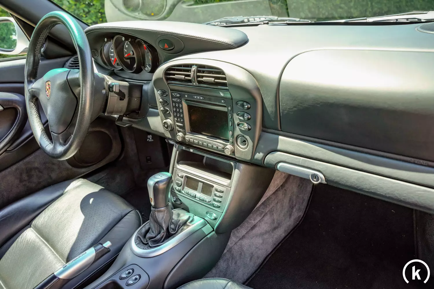 Mit schwarzem Leder ist das Interieur dieses 996 Cabriolets ausgekleidet: Sitze, Türtafeln, 3-Speichen Lenkrad, Schaltknauf inkl. Schaltsack, Handbremshebel und das Armaturenbrett sind mit Leder überzogen. Bis auf minimale Abnutzungserscheinungen sind dem Innenraum des Porsche weder Fehlteile noch Defekte zuzusprechen. Zu den Ausstattungsmerkmalen zählen unter anderem: 4 elektrische Fensterheber, elektrisch verstellbare Sitze, Sitzheizung, Klimaanlage, eine Heckscheibenheizung und ein Radio mit Navigationssystem. Des Weiteren ist ein in Wagenfarbe gehaltenes Hardtop in einwandfreiem Zustand vorliegend.
