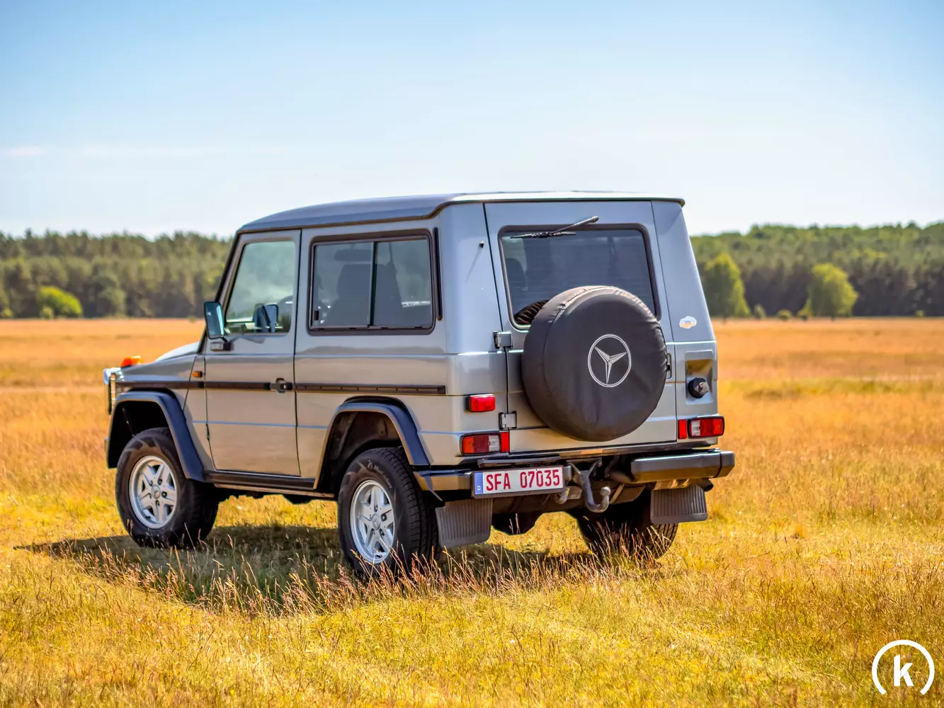 Schaut man auf die Seite der G-Klasse sieht man die originalen Serienfelgen auf den großen Reifen montiert. Die Reifen sind neuwertig, so dass das Fahrzeug sofort einsatzbereit ist. Egal ob wie hier in der Lüneburger Heide, oder bei einer Safari in Kenia. Einsteigen, losfahren, genießen. Für die nötige Verzögerung sorgen die ebenfalls neuwertigen Bremsen. Ein weiteres Extra stellt der Frontschutzbügel dar.