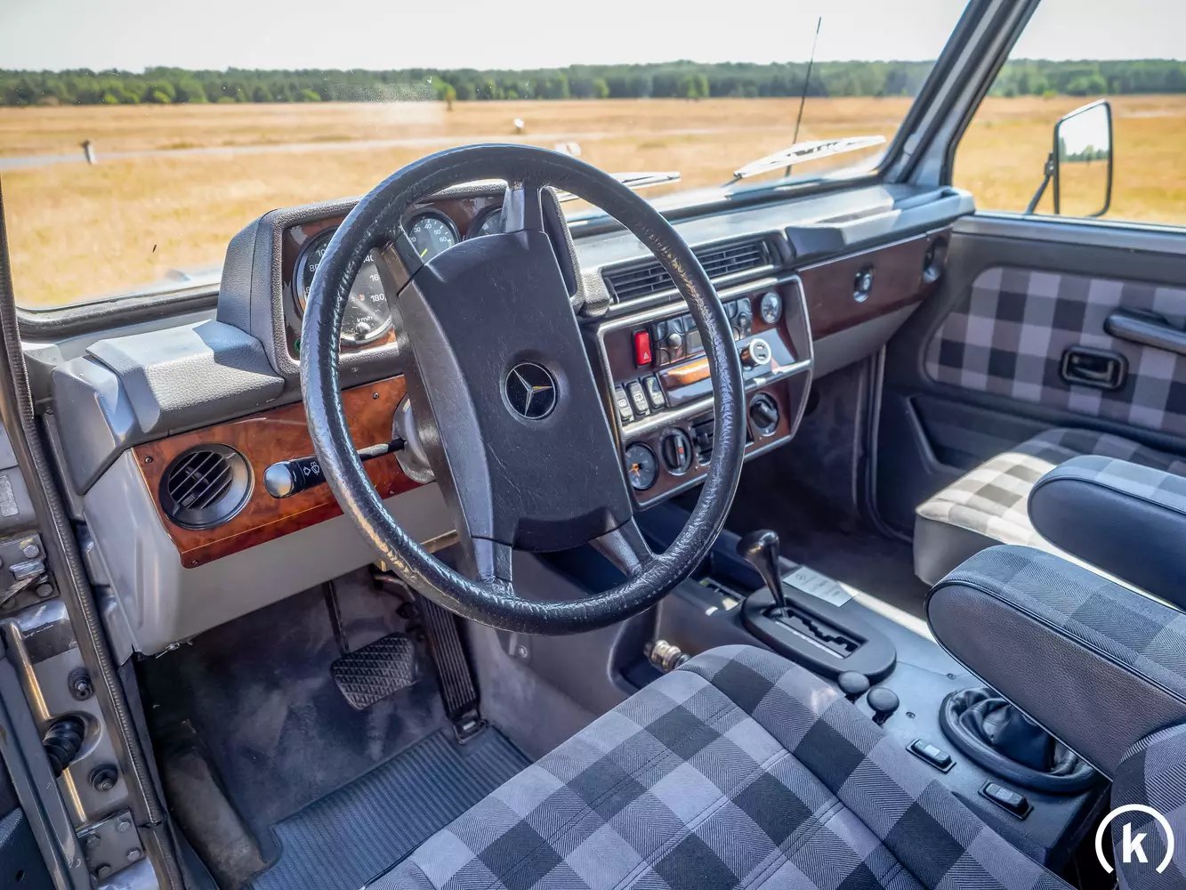 Blickt man in den Innenraum, fällt sofort der extrem gepflegte, allgemeine Zustand auf. Die karierten Sitze sind nicht durchgesessen und insgesamt gibt es nur leichte Abnutzungsspuren. Da es sich hier um die 10. Jahre Sonderedition handelt, bei welcher eine Plakette im Bereich der Schaltkulisse ist, hat die G-Klasse ein paar Sonderausstattungen. Das Holzarmaturenbrett und auch der Mercedes Stern auf der Haube sind zwei Merkmale dieser Edition. Außerdem gibt es Servo, Zentralverriegelung, elektrische Fensterheber, Sitzheizung und natürlich ein Radio. Das Radio ist selbstverständlich original und ist ein Blaupunkt mit Kassette.