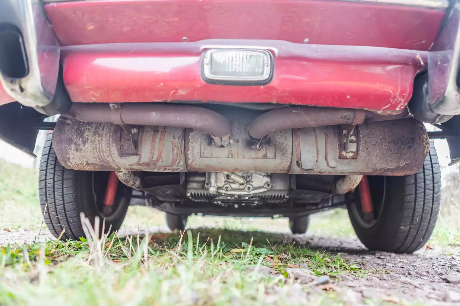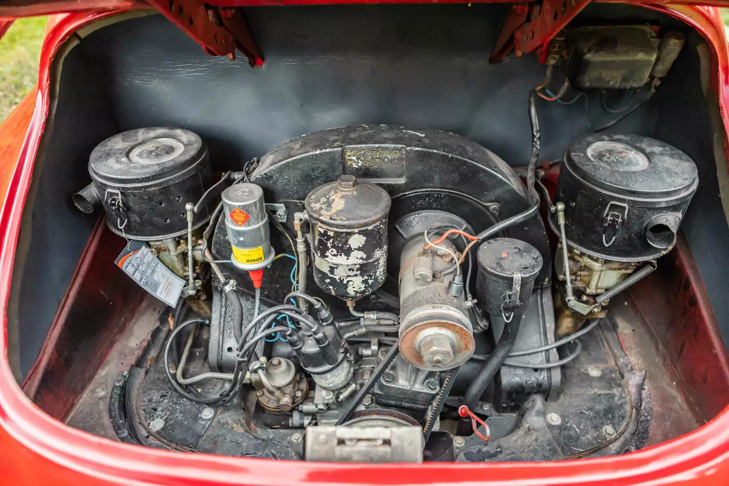 Der 356 ist in der Originalfarbe Signalrot nachlackiert worden. Die Außenhaut weist dem Halter zufolge keine optischen Mängel auf. Äußere Modifikationen liegen demnach ebenfalls nicht vor. Das Fahrzeug steht auf den originalen Felgen mit originalen Radzierblenden. Der Zustand der Reifen wird vom aktuellen Halter als gut bewertet, Modifikationen liegen in diesem Bereich nicht vor. Die Bremsen werden vom Halter ebenfalls als gut bewertet, Mängel liegen den uns vorliegenden Informationen zufolge nicht vor.
