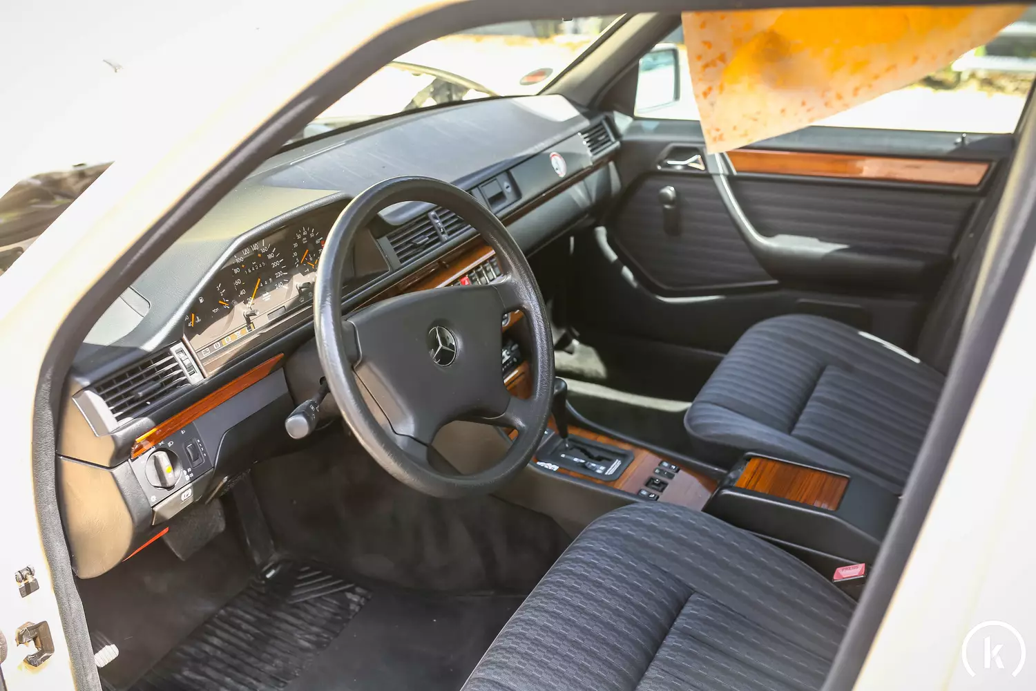 Schwarze Stoffsitze mit Streifenmuster zieren den Innenraum dieses 260E: Rissfrei präsentiert sich das Armaturenbrett, die Türtafeln sind unbeschädigt, die Sitze bis auf eine verschlissene Flanke des Fahrersitzes in ordentlichem Zustand und der Fußraumteppich fleckenfrei. Am Dachhimmel löst sich der Stoff. Sämtliche Holzfurniere im Interieur weisen einen guten Erhaltungszustand auf. Zur Ausstattung dieses W 124 zählen folgende Merkmale: Schiebedach, Servolenkung, Zentralverriegelung, Klimaanlage, ABS, Standheizung, 90 Liter Tank, Wärmedämmendes Glas, Kopfstützen im Fond sowie ein Sony Zubehörradio mit CD-Spieler.