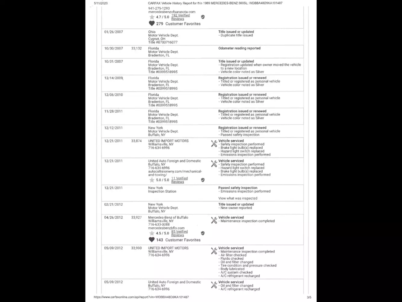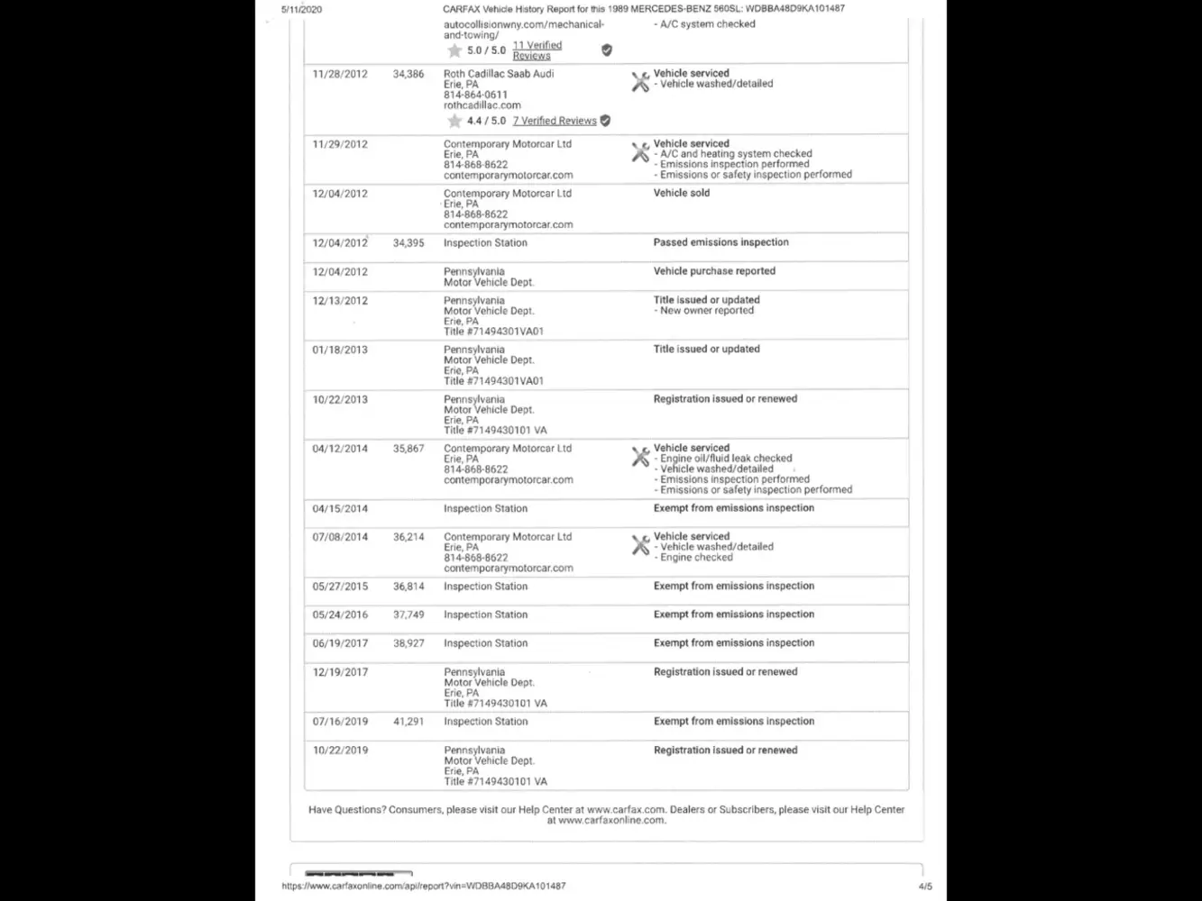 Der letzte Carfax-Eintrag ist vom 22.10.2019. Insgesamt sind 42 Einträge seit 20.7.1989 vorhanden. Davon 19 Serviceeinträge und 16 mit Meilenangabe. Das Carfax weist keinen Unfall aus und ich selbst hatte auch keinen zu Fall mit dem Wagen. Ich versuche das gesamte Carfax noch einstellen zu lassen.