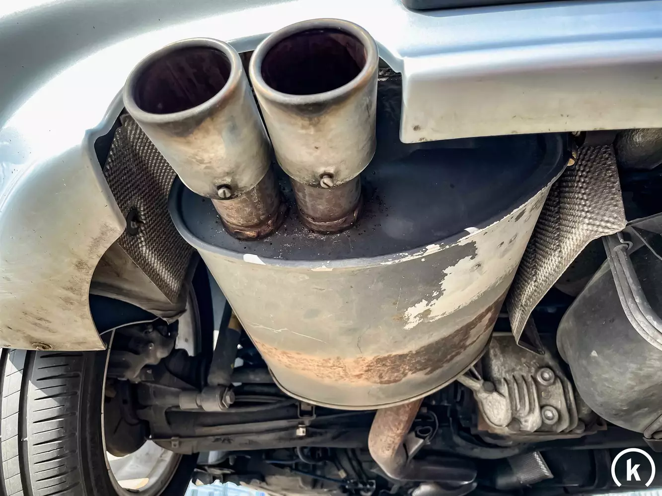 Bei der Farbe handelt es sich um Arctic Silver, wobei sowohl die Motorhaube als auch der Kotflügel hinten links nach Verkäuferaussage bereits nachlackiert werden mussten. Sonstige äußerliche Modifikationen sind bis auf eine leicht verwitterte Motorhaube nicht vorhanden.