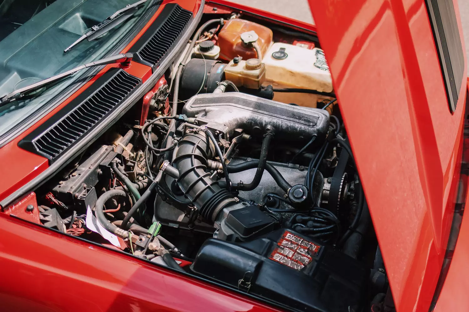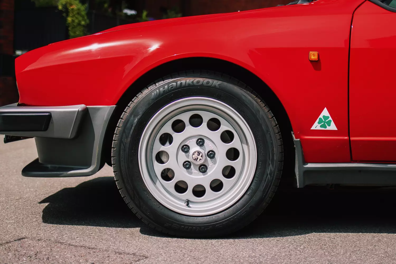 Dadurch, dass dieser GTV6 bereits über das ab 1980 eingeführte Facelift verfügt, besitzt er äußerlich schon schwarze Kunststoffstoßstangen, schwarze Schwellerverkleidungen sowie einen Kunststofffrontspoiler. Trotz teilweiser Restaurationsarbeiten sind an der an verschiedensten Stellen bereits nachlackierten in klassischem Alfa Romeo Rot gehaltenen Karosserie diverse Gebrauchsspuren ersichtlich. Laut Verkäuferangaben halten sich die Roststellen in Grenzen: An den Scheibenecken der Heckscheibe sowie vorne links am Kotflügel, sobald man die Motorhaube öffnet, sind Korrosionsstellen vorzufinden. Bis auf diese Makel zeigt sich die Karosserie des Alfa Romeo in einem gesunden Zustand. Bis auf eine ANSA Sportauspuffanlage sind Modifikationen am Exterieur abweichend vom Originalzustand nicht zu beanstanden, zudem weist der Verkäufer darauf hin, dass dieser GTV6 unfallfrei ist.