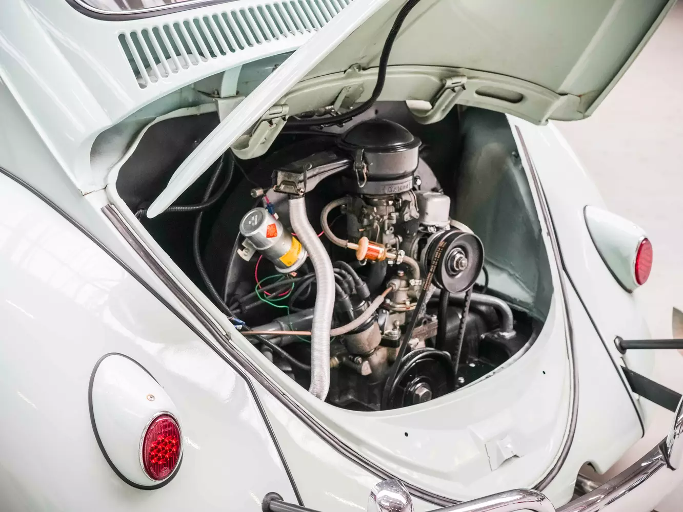 34 PS leistet der 1,2-Liter Boxermotor im Heck des Käfers, geschaltet wird über eine 4-Gang Mittelschaltung. Eine Überholung des Motors fand 2013 im Auftrag des Vorbesitzers statt: Dabei kamen Pleuellager, Kolben, Ölpumpe und Ventilführungen neu. Zudem wurden Vergaser, Anlasser und Lichtmaschine überholt. Im Zuge dieser Arbeiten wurden auch das Lenkgetriebe sowie die Kupplung, der Auspuff und die Heizbirnen erneuert. Der Verkäufer lässt erwähnen, dass der luftgekühlte Boxermotor sofort anspringt und sehr gut läuft, zudem lässt sich auch das Getriebe tadellos schalten. Ende 2021 fand ein letzter Service statt.