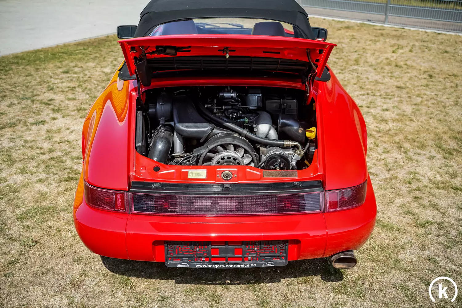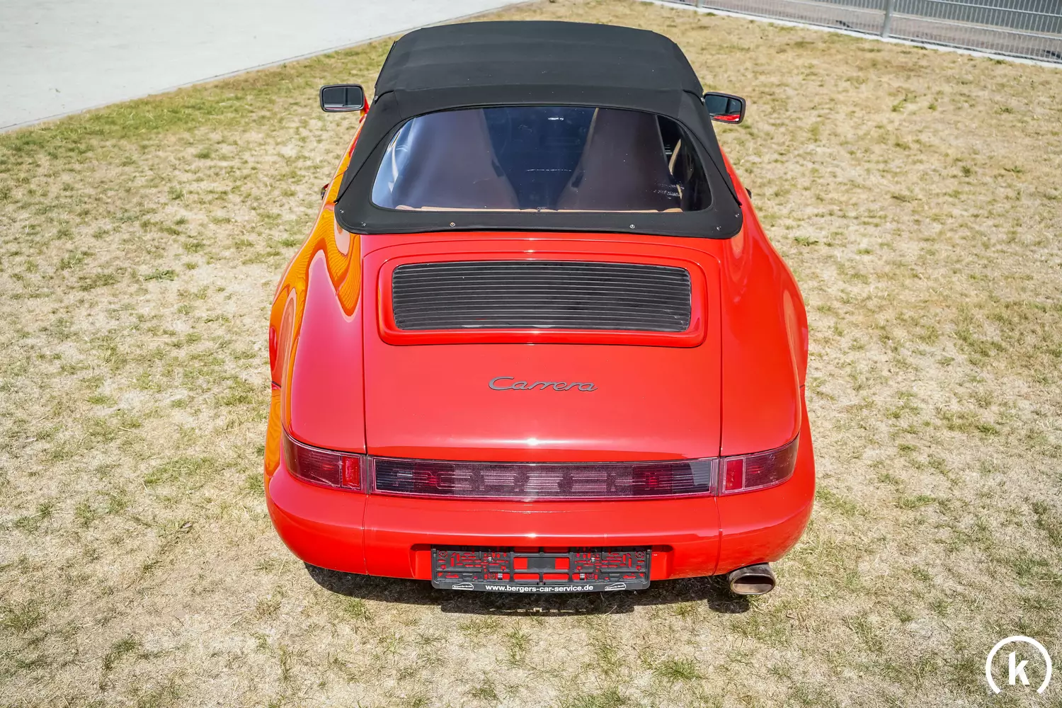 Im jetzigen Besitz unfallfrei gibt sich die in Rot gehaltene Cabriolet-Karosserie dieses Porsche 911 – Nachlackierungen sind dem Verkäufer keine bekannt, als äußerliche Mängel gibt dieser durch die Jahre und mit der Laufleistung entstehende Gebrauchsspuren sowie an der Front unfachmännisch ausgebesserte Steinschläge an. Modifikationen abweichend vom Originalzustand können dem Exterieur nicht entnommen werden, des Weiteren sind keinerlei Farbunterschiede im Lack ersichtlich und Korrosion an diesem 964 ist augenscheinlich nicht vorzufinden. Dem schwarzen Stoffverdeck können weder Risse noch grobe Scheuerspuren entnommen werden – auch die Plastikheckscheibe zeigt sich mängelfrei.