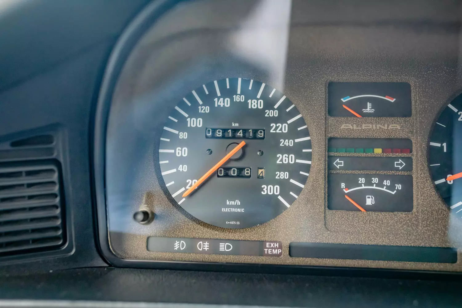 In der Tachoeinheit blickt man auf rot gefärbte Zeiger und schwarz hinterlegte Anzeigen, der Tacho steht momentan auf 91.419 Kilometern. Die Gesamtlaufleistung des Alpina B10 ist umfangreich dokumentiert und es liegt sogar noch ein Scheckheft vor. Alle Instrumente im Innenraum weisen eine anstandslose Funktion auf.